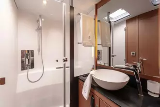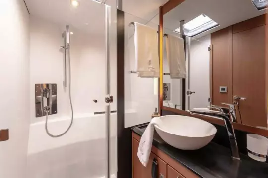 Finally, the aft living area can be configured as either an owner’s cabin or as two cabins, featuring one double berth on starboard, and a twin bunk to port.