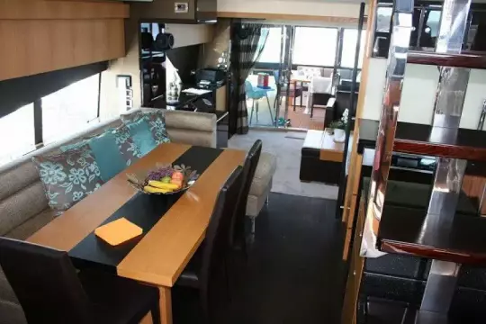 - Custom port cabin: inboard bed slides so cabin can have 2 x twin beds or 1 x double bed