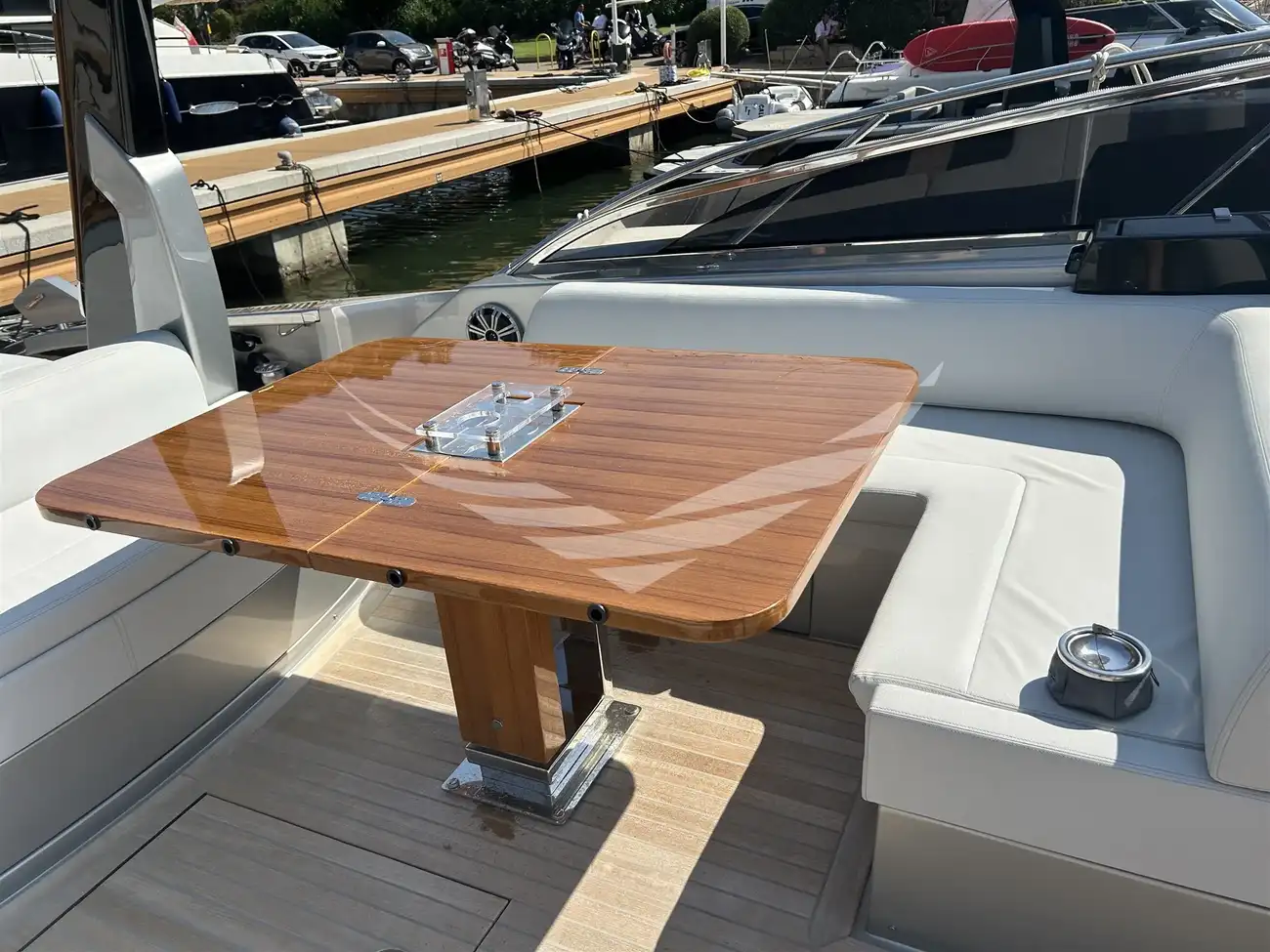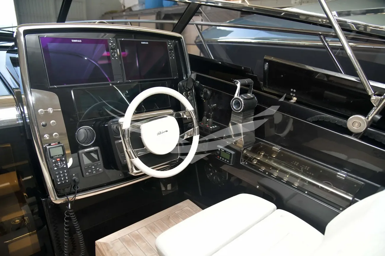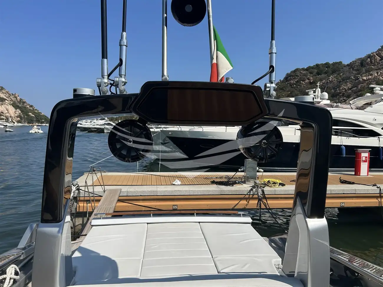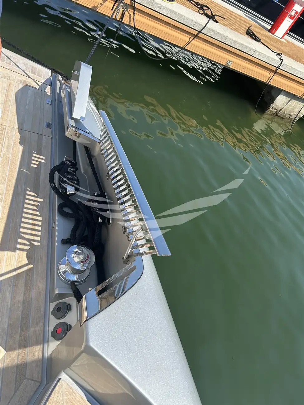 Guest Cabin: Currently equipped with only one bed; the second bed is available as it is preserved. Cockpit cabinet: The modification of the starboard side cabinet, in the final part towards the stern, has transformed the cabinet into a bench, offering two additional seats when the cockpit table is extended with extensions. Steel Cover of the Bollards: The cover above the aft mooring cleats has been updated to be openable, allowing for faster and easier maneuverability in mooring. Bow Winch Locker: The locker above the bow winch has been split in two, making the opening less heavy and more practical. Navigation equipment: Rudder angle indicator, Electronic engine control (e' stato reso piu alto rispetto all'originale), Depth Sounder (Simrad), GPS (Simrad), Autopilot (Simrad), VHF Radio (Simrad). Staging and technical: Fume/Gas Detector, Engine Alarm, Bilge Alarm, Anchor (In acciaio), Water pressure pump, Auto-Trim, Folding cleats, Teak Side Decks, Deck Shower, Directional Spotlight, Hydraulic Flaps, Fire Extinguishing System, Flaps Indicators, Anchor Chain Washdown, Washbasin in the cockpit, Courtesy Lights, Gangway (a scomparsa), Platform, Automatic Bilge Pump, Manual Bilge Pump, Entry door, Teak Cockpit, Shorepower connector, Water harbor connector system, Voltage Rectifier, Electric Windlass, swimming ladder (Elettrica), Waste Water Purifier System, Stabilizers (Seakeeper), Outboard Engine Support Bracket, cockpit table (Con prolunghe), guard rails with gates, Horn, Stern Winches, Bow Winches. Domestic Facilities onboard: Air Conditioning (Doppio ciclo), Warm Water System, Inverter Air Conditioning, Light Dimmer, Waste Water Plant, 220V Outlets, Black Water Tank, Electric Toilet. Security equipment: Barometer, Smoke buoy, First aid kit, Life Jackets, Safety equipment within 50 miles, PFDs. Entertainment: Speakers (Maggiorati), Hi-Fi. Kitchen and appliances: Galley (Elettrica), Deck Refrigerator, ICE Maker, Dishwasher, Electric hot plate. Upholstery: Cockpit Cover, Cushions, Stern Cushions, Cockpit Cushions.