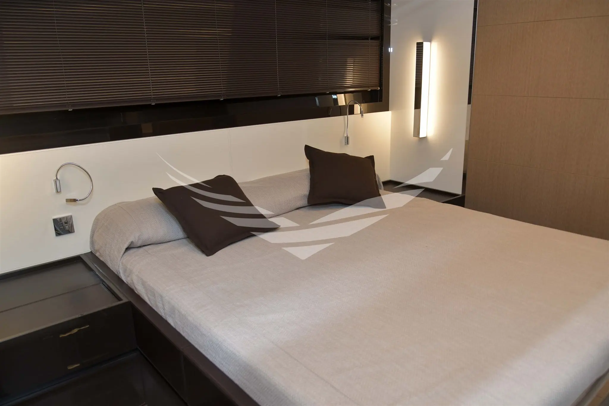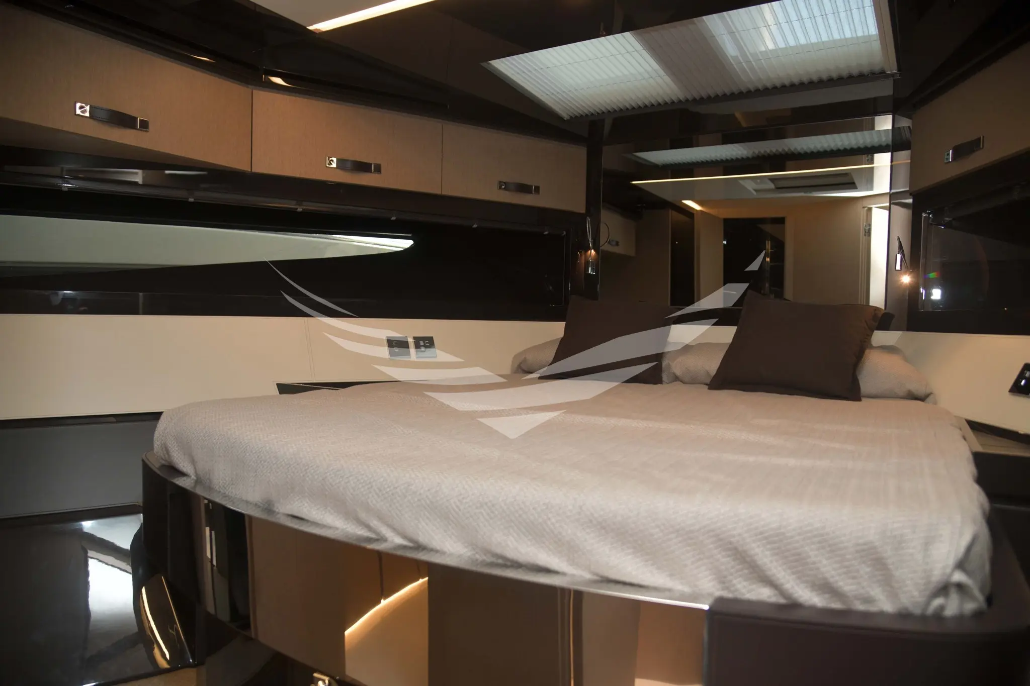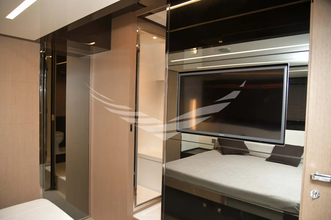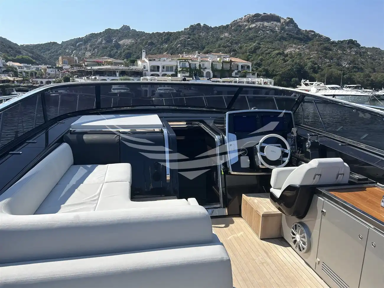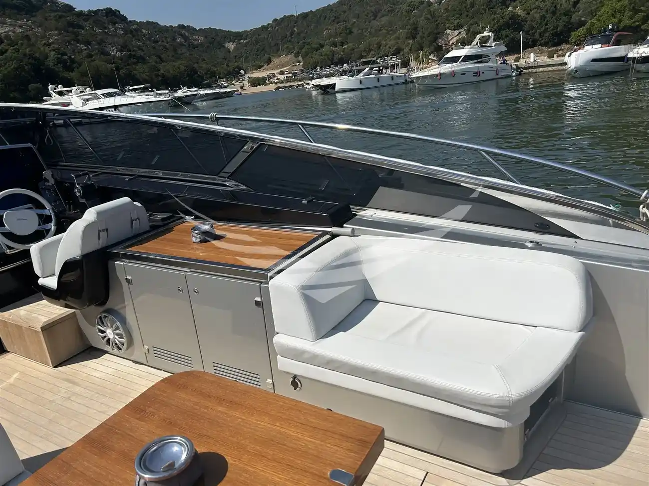 Guest Cabin: Currently equipped with only one bed; the second bed is available as it is preserved. Cockpit cabinet: The modification of the starboard side cabinet, in the final part towards the stern, has transformed the cabinet into a bench, offering two additional seats when the cockpit table is extended with extensions. Steel Cover of the Bollards: The cover above the aft mooring cleats has been updated to be openable, allowing for faster and easier maneuverability in mooring. Bow Winch Locker: The locker above the bow winch has been split in two, making the opening less heavy and more practical. Navigation equipment: Rudder angle indicator, Electronic engine control (e' stato reso piu alto rispetto all'originale), Depth Sounder (Simrad), GPS (Simrad), Autopilot (Simrad), VHF Radio (Simrad). Staging and technical: Fume/Gas Detector, Engine Alarm, Bilge Alarm, Anchor (In acciaio), Water pressure pump, Auto-Trim, Folding cleats, Teak Side Decks, Deck Shower, Directional Spotlight, Hydraulic Flaps, Fire Extinguishing System, Flaps Indicators, Anchor Chain Washdown, Washbasin in the cockpit, Courtesy Lights, Gangway (a scomparsa), Platform, Automatic Bilge Pump, Manual Bilge Pump, Entry door, Teak Cockpit, Shorepower connector, Water harbor connector system, Voltage Rectifier, Electric Windlass, swimming ladder (Elettrica), Waste Water Purifier System, Stabilizers (Seakeeper), Outboard Engine Support Bracket, cockpit table (Con prolunghe), guard rails with gates, Horn, Stern Winches, Bow Winches. Domestic Facilities onboard: Air Conditioning (Doppio ciclo), Warm Water System, Inverter Air Conditioning, Light Dimmer, Waste Water Plant, 220V Outlets, Black Water Tank, Electric Toilet. Security equipment: Barometer, Smoke buoy, First aid kit, Life Jackets, Safety equipment within 50 miles, PFDs. Entertainment: Speakers (Maggiorati), Hi-Fi. Kitchen and appliances: Galley (Elettrica), Deck Refrigerator, ICE Maker, Dishwasher, Electric hot plate. Upholstery: Cockpit Cover, Cushions, Stern Cushions, Cockpit Cushions.