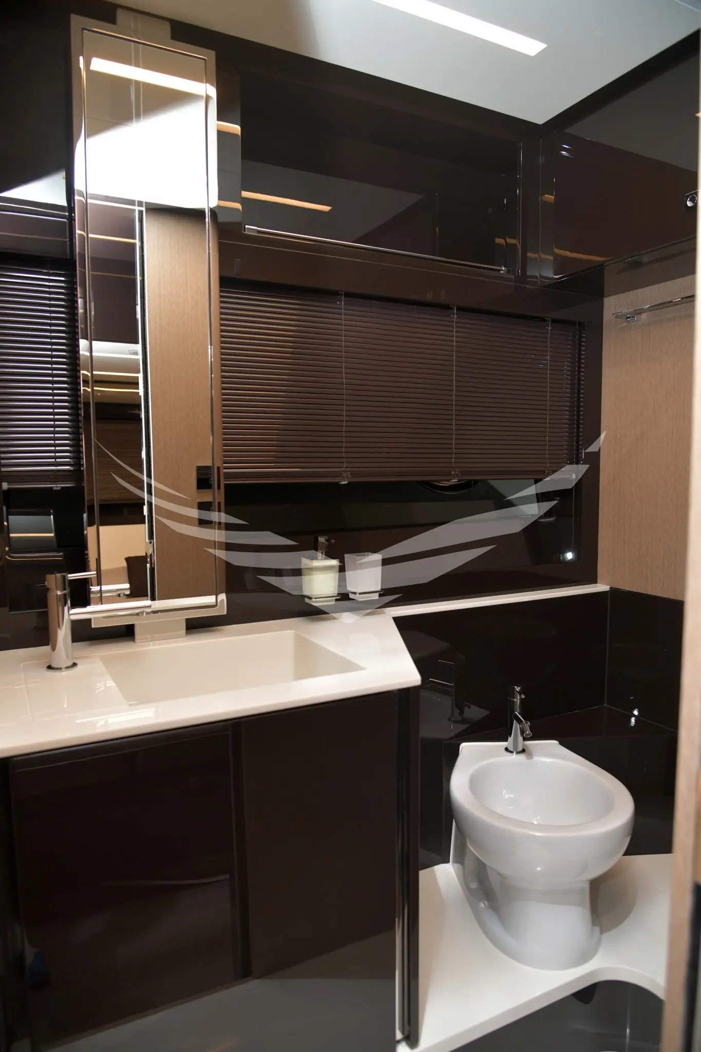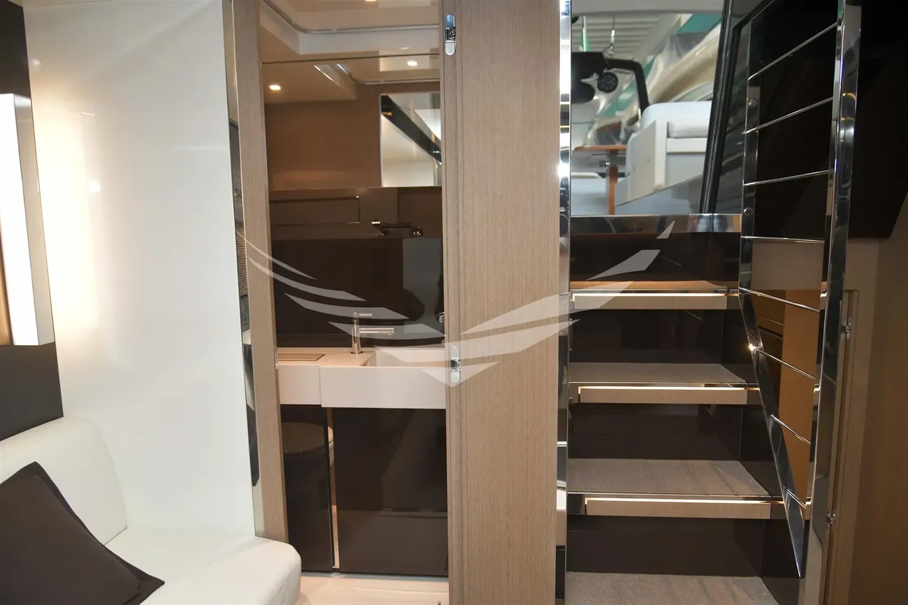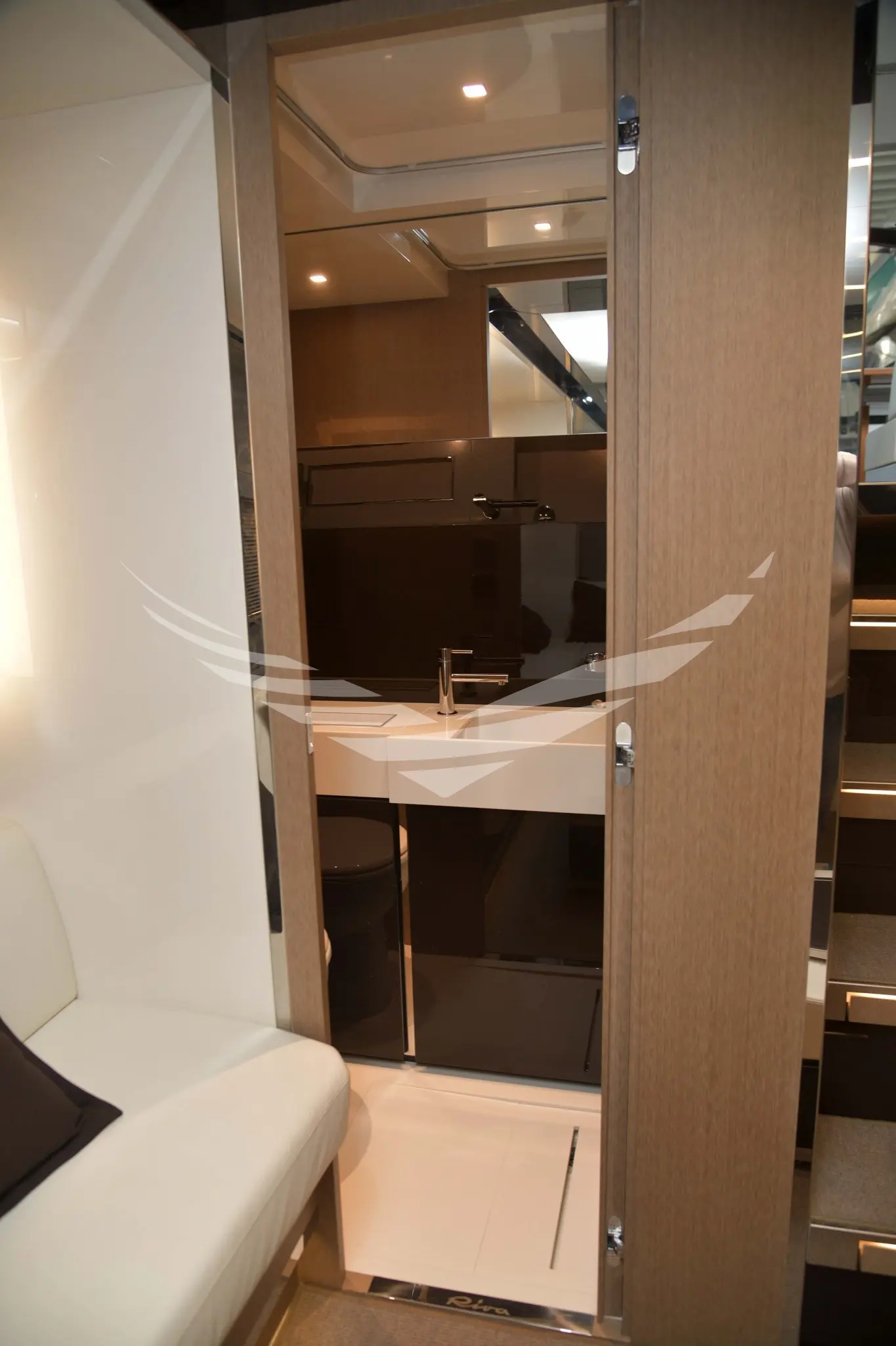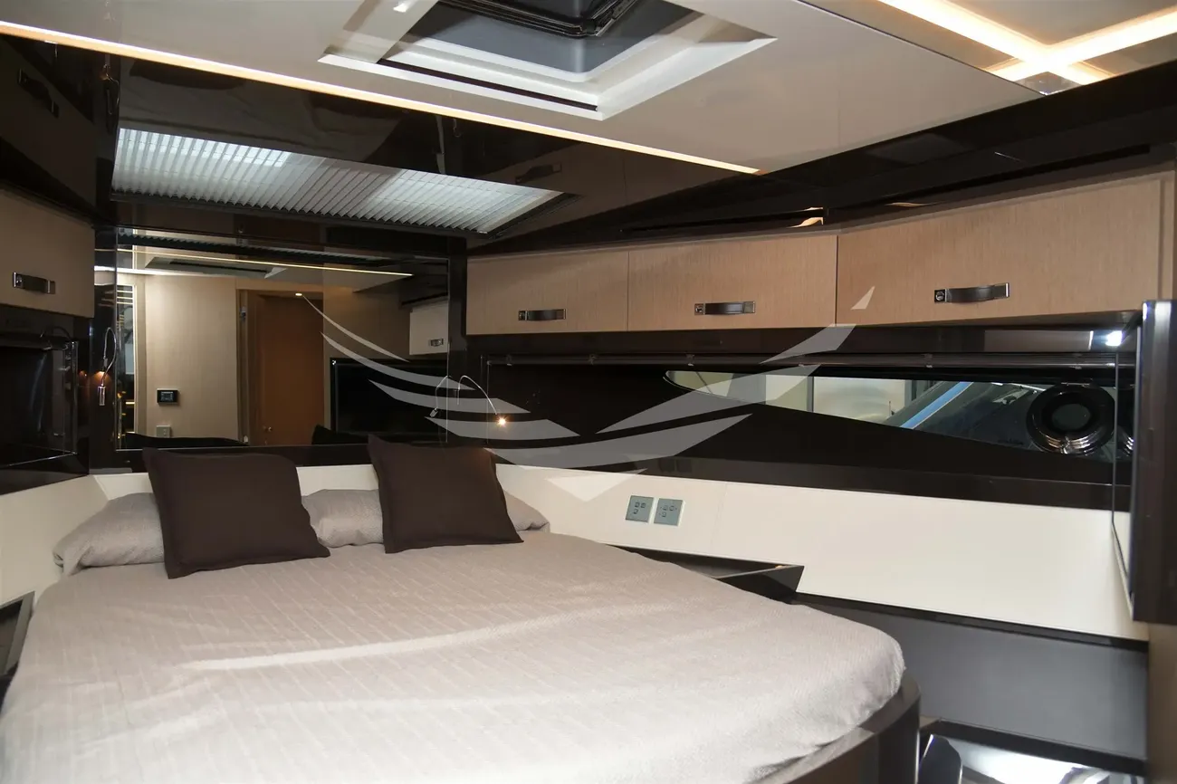 Guest Cabin: Currently equipped with only one bed; the second bed is available as it is preserved. Cockpit cabinet: The modification of the starboard side cabinet, in the final part towards the stern, has transformed the cabinet into a bench, offering two additional seats when the cockpit table is extended with extensions. Steel Cover of the Bollards: The cover above the aft mooring cleats has been updated to be openable, allowing for faster and easier maneuverability in mooring. Bow Winch Locker: The locker above the bow winch has been split in two, making the opening less heavy and more practical. Navigation equipment: Rudder angle indicator, Electronic engine control (e' stato reso piu alto rispetto all'originale), Depth Sounder (Simrad), GPS (Simrad), Autopilot (Simrad), VHF Radio (Simrad). Staging and technical: Fume/Gas Detector, Engine Alarm, Bilge Alarm, Anchor (In acciaio), Water pressure pump, Auto-Trim, Folding cleats, Teak Side Decks, Deck Shower, Directional Spotlight, Hydraulic Flaps, Fire Extinguishing System, Flaps Indicators, Anchor Chain Washdown, Washbasin in the cockpit, Courtesy Lights, Gangway (a scomparsa), Platform, Automatic Bilge Pump, Manual Bilge Pump, Entry door, Teak Cockpit, Shorepower connector, Water harbor connector system, Voltage Rectifier, Electric Windlass, swimming ladder (Elettrica), Waste Water Purifier System, Stabilizers (Seakeeper), Outboard Engine Support Bracket, cockpit table (Con prolunghe), guard rails with gates, Horn, Stern Winches, Bow Winches. Domestic Facilities onboard: Air Conditioning (Doppio ciclo), Warm Water System, Inverter Air Conditioning, Light Dimmer, Waste Water Plant, 220V Outlets, Black Water Tank, Electric Toilet. Security equipment: Barometer, Smoke buoy, First aid kit, Life Jackets, Safety equipment within 50 miles, PFDs. Entertainment: Speakers (Maggiorati), Hi-Fi. Kitchen and appliances: Galley (Elettrica), Deck Refrigerator, ICE Maker, Dishwasher, Electric hot plate. Upholstery: Cockpit Cover, Cushions, Stern Cushions, Cockpit Cushions.