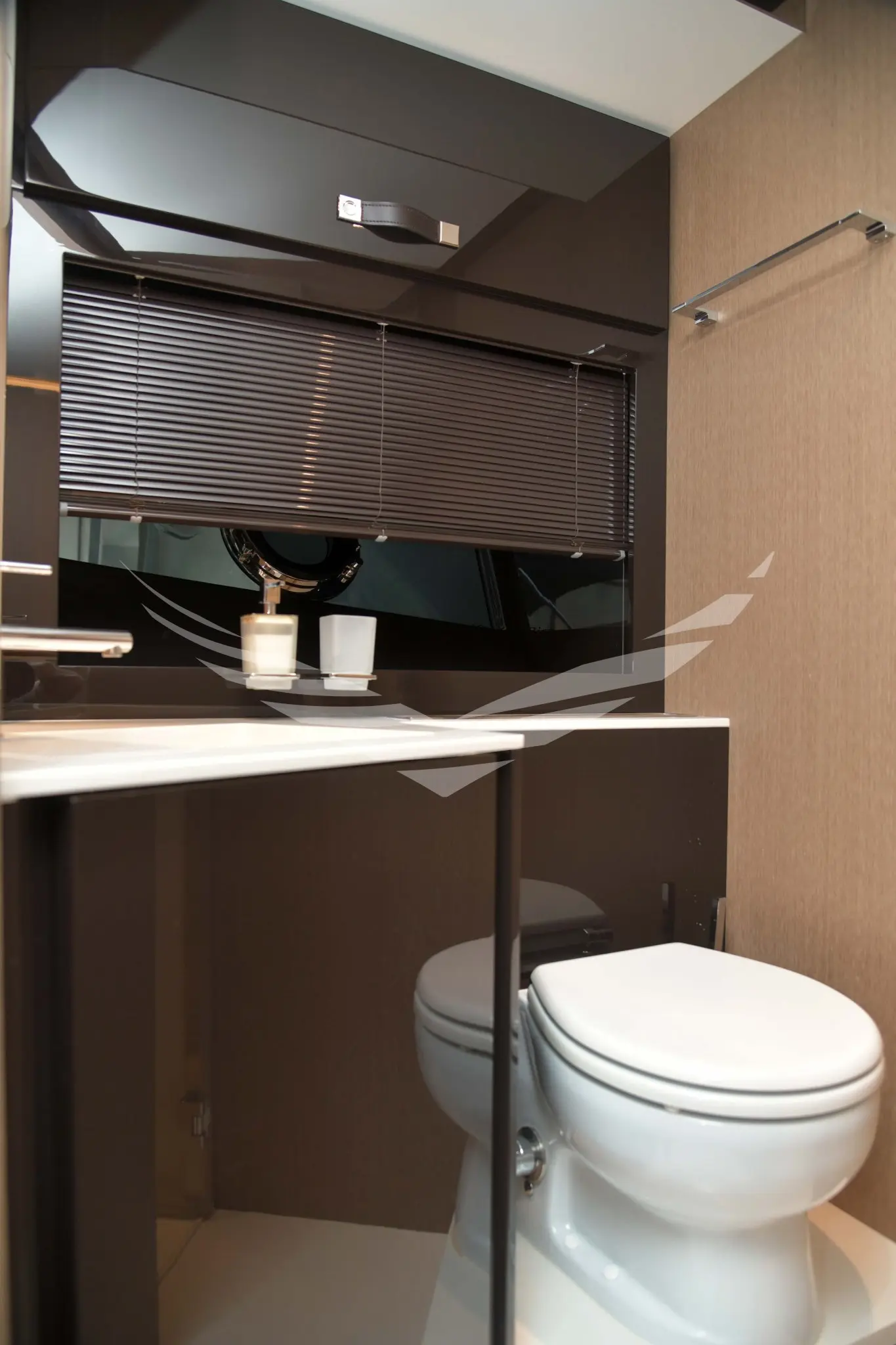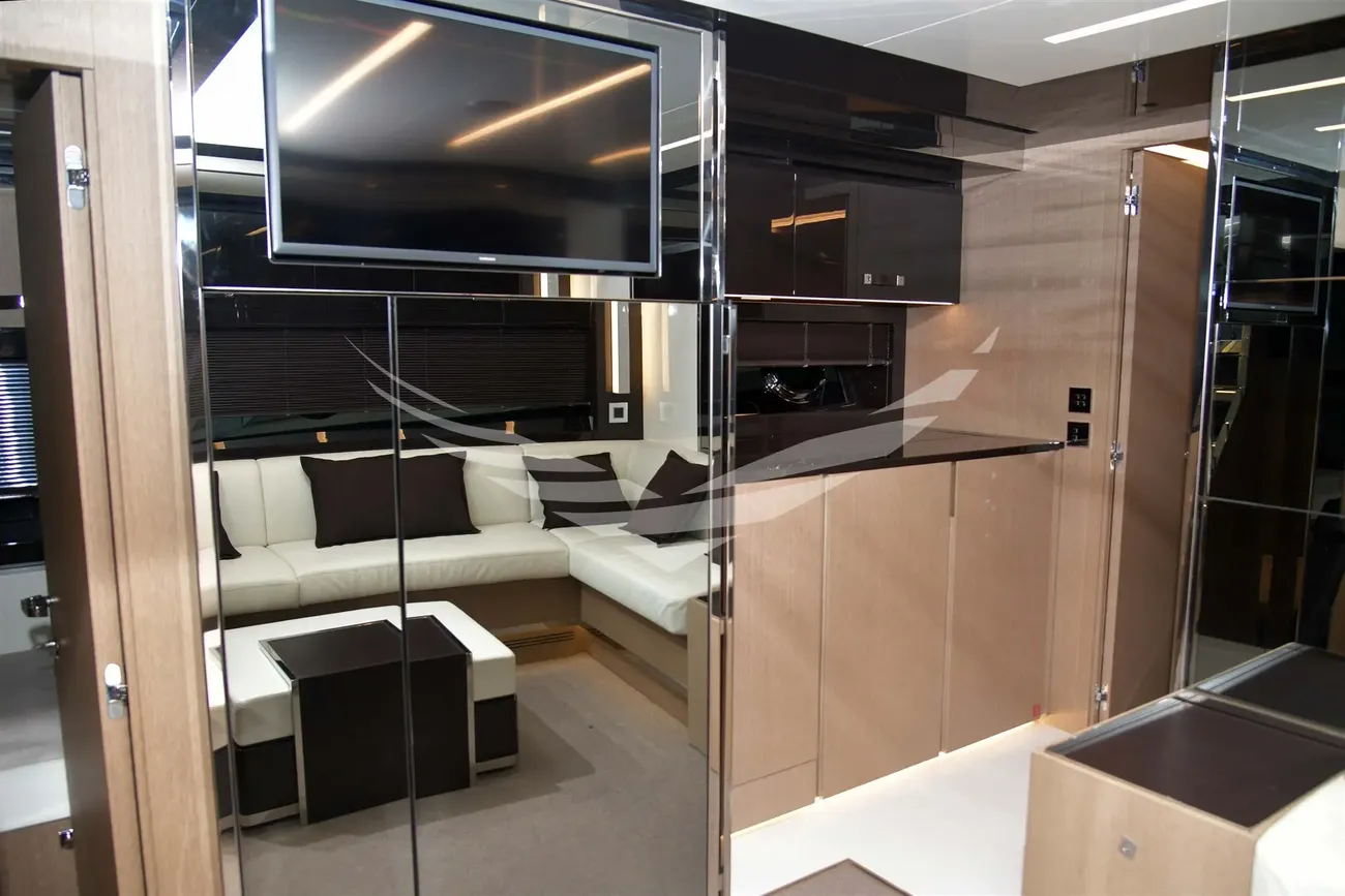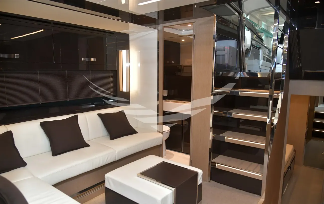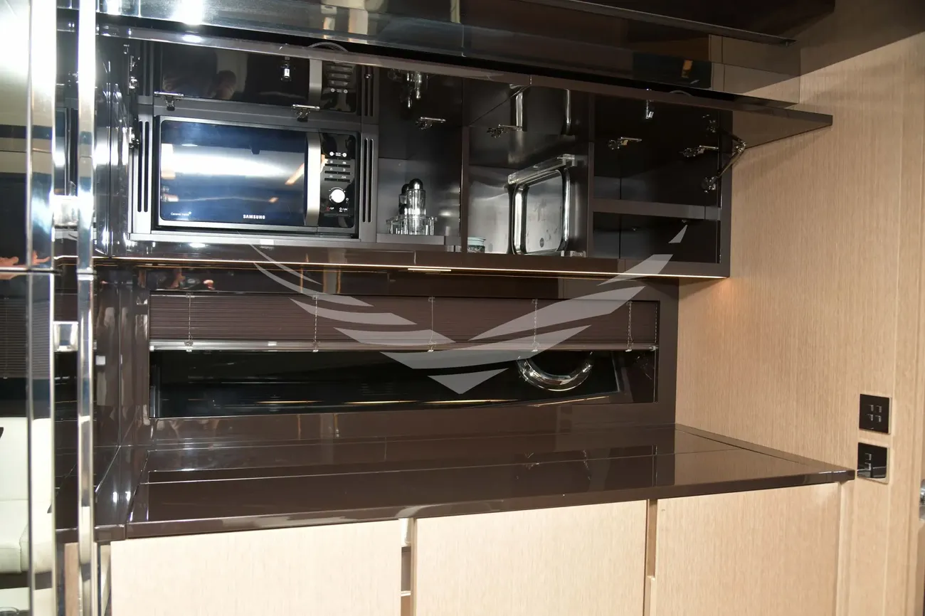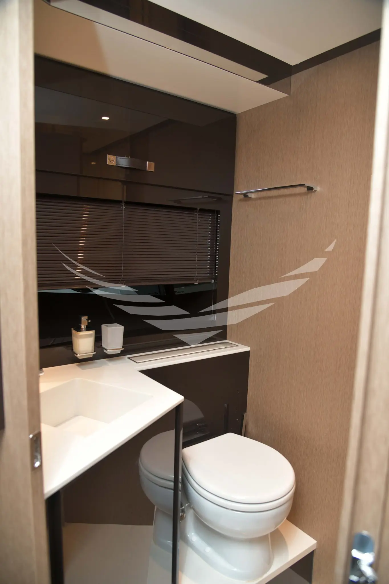 Guest Cabin: Currently equipped with only one bed; the second bed is available as it is preserved. Cockpit cabinet: The modification of the starboard side cabinet, in the final part towards the stern, has transformed the cabinet into a bench, offering two additional seats when the cockpit table is extended with extensions. Steel Cover of the Bollards: The cover above the aft mooring cleats has been updated to be openable, allowing for faster and easier maneuverability in mooring. Bow Winch Locker: The locker above the bow winch has been split in two, making the opening less heavy and more practical. Navigation equipment: Rudder angle indicator, Electronic engine control (e' stato reso piu alto rispetto all'originale), Depth Sounder (Simrad), GPS (Simrad), Autopilot (Simrad), VHF Radio (Simrad). Staging and technical: Fume/Gas Detector, Engine Alarm, Bilge Alarm, Anchor (In acciaio), Water pressure pump, Auto-Trim, Folding cleats, Teak Side Decks, Deck Shower, Directional Spotlight, Hydraulic Flaps, Fire Extinguishing System, Flaps Indicators, Anchor Chain Washdown, Washbasin in the cockpit, Courtesy Lights, Gangway (a scomparsa), Platform, Automatic Bilge Pump, Manual Bilge Pump, Entry door, Teak Cockpit, Shorepower connector, Water harbor connector system, Voltage Rectifier, Electric Windlass, swimming ladder (Elettrica), Waste Water Purifier System, Stabilizers (Seakeeper), Outboard Engine Support Bracket, cockpit table (Con prolunghe), guard rails with gates, Horn, Stern Winches, Bow Winches. Domestic Facilities onboard: Air Conditioning (Doppio ciclo), Warm Water System, Inverter Air Conditioning, Light Dimmer, Waste Water Plant, 220V Outlets, Black Water Tank, Electric Toilet. Security equipment: Barometer, Smoke buoy, First aid kit, Life Jackets, Safety equipment within 50 miles, PFDs. Entertainment: Speakers (Maggiorati), Hi-Fi. Kitchen and appliances: Galley (Elettrica), Deck Refrigerator, ICE Maker, Dishwasher, Electric hot plate. Upholstery: Cockpit Cover, Cushions, Stern Cushions, Cockpit Cushions.