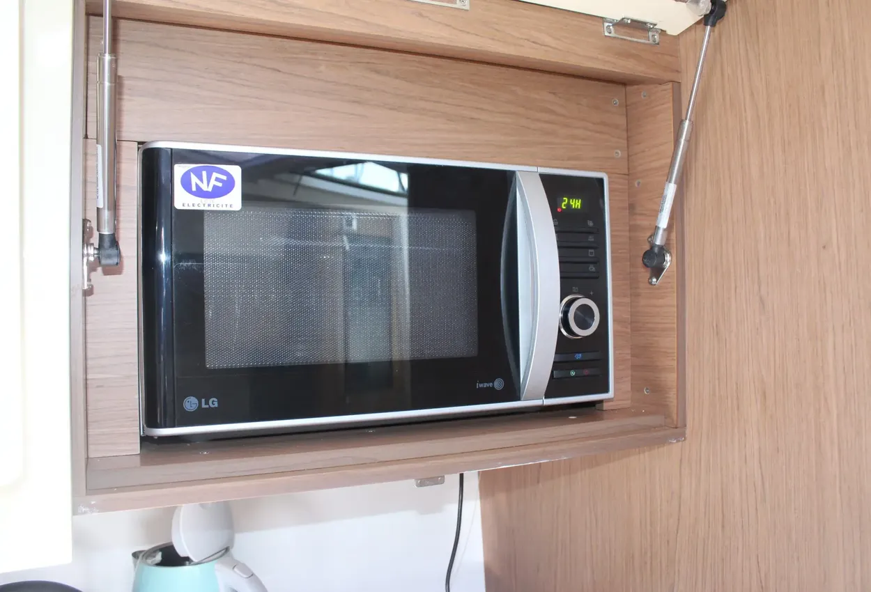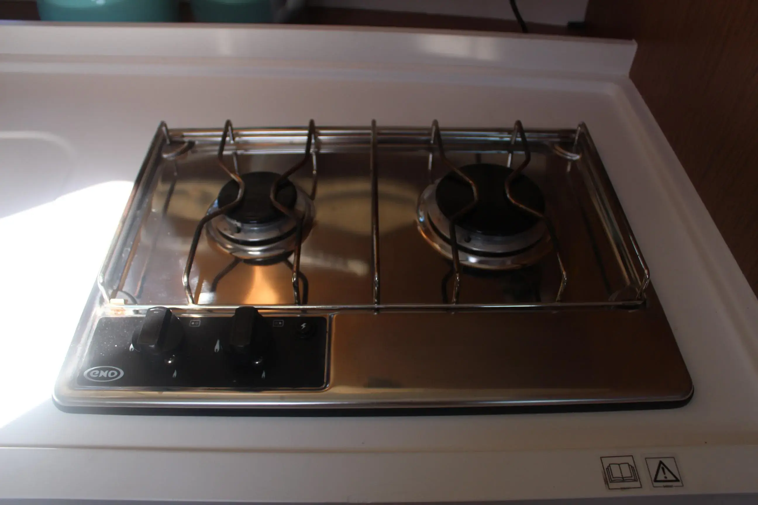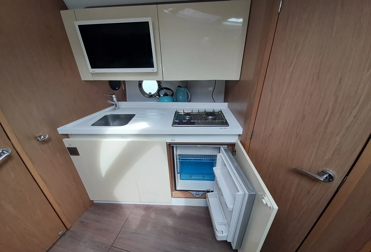 Linear to starboard with high gloss cupboards, stainless steel sink with hot and cold mixer taps, Eno 2-burner gas hob, Dometic fridge, LG Microwave, and storage.