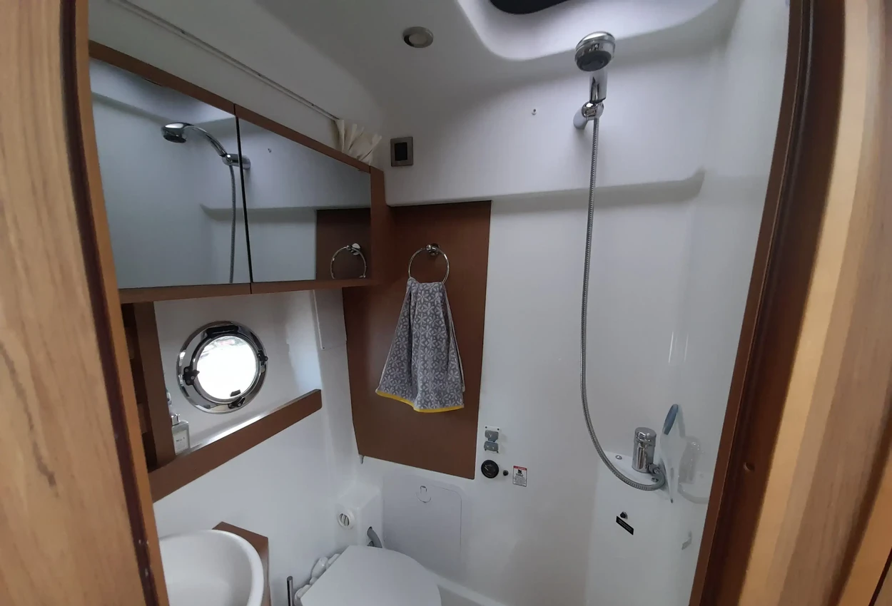 Located aft to starboard, electric flush toilet, sink, and separate shower with shower curtain