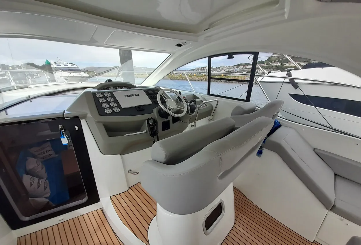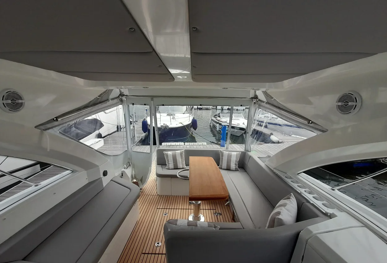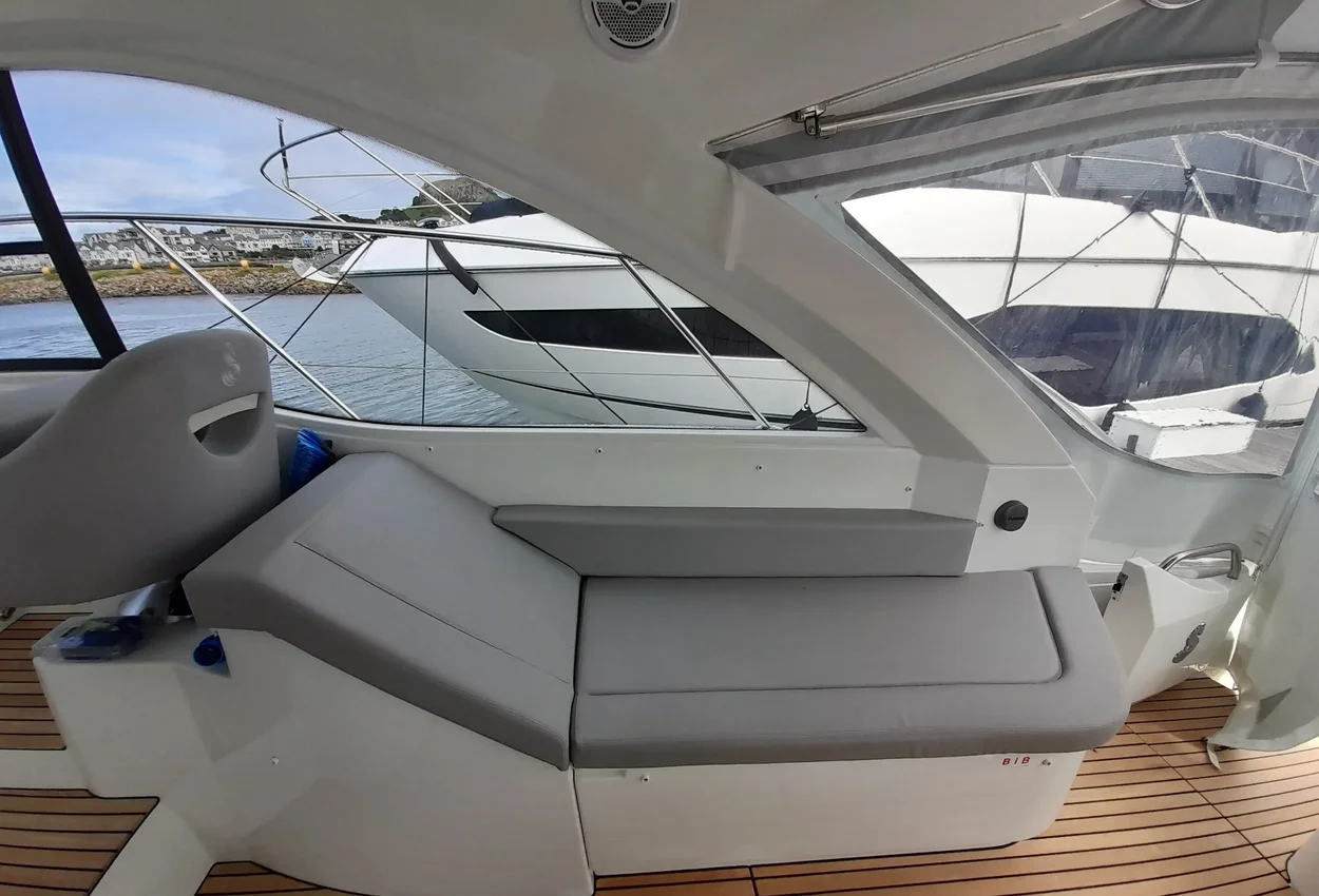Step onboard and be greeted by a spacious cockpit area, perfect for entertaining guests or simply relaxing in the sun. The well-designed layout provides ample seating and lounging options, ensuring everyone on board can enjoy the journey in absolute comfort. The large swim platform at the aft offers easy access to the water, making it ideal for water sports enthusiasts.