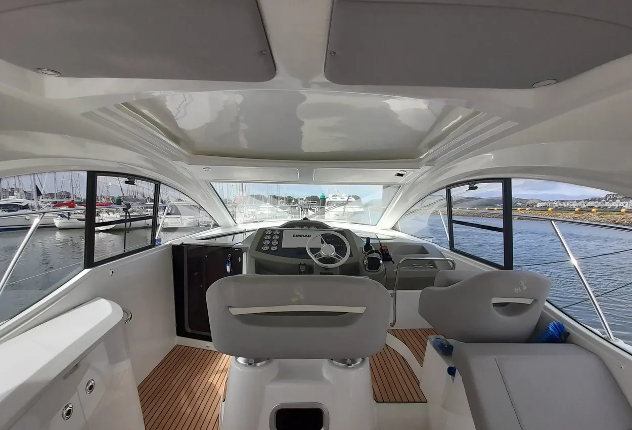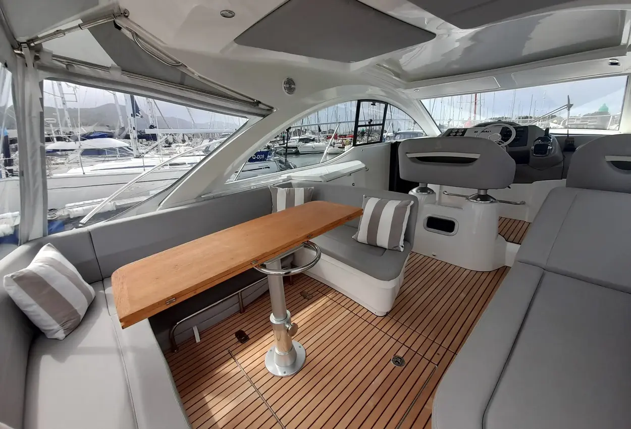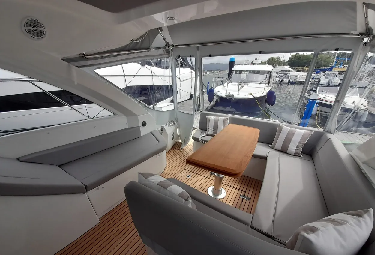 Step onboard and be greeted by a spacious cockpit area, perfect for entertaining guests or simply relaxing in the sun. The well-designed layout provides ample seating and lounging options, ensuring everyone on board can enjoy the journey in absolute comfort. The large swim platform at the aft offers easy access to the water, making it ideal for water sports enthusiasts.