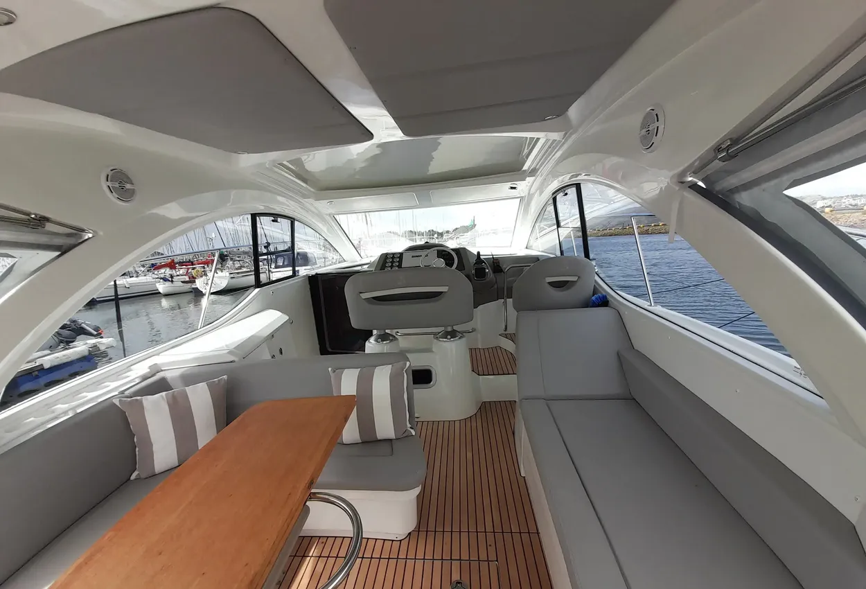 Electronic opening hard top, three forward facing seats for helm and co-pilot, U-shaped seating around wooden table that converts to a sun pad, wet bar with sink, Vitronic griddle hob, and fridge.