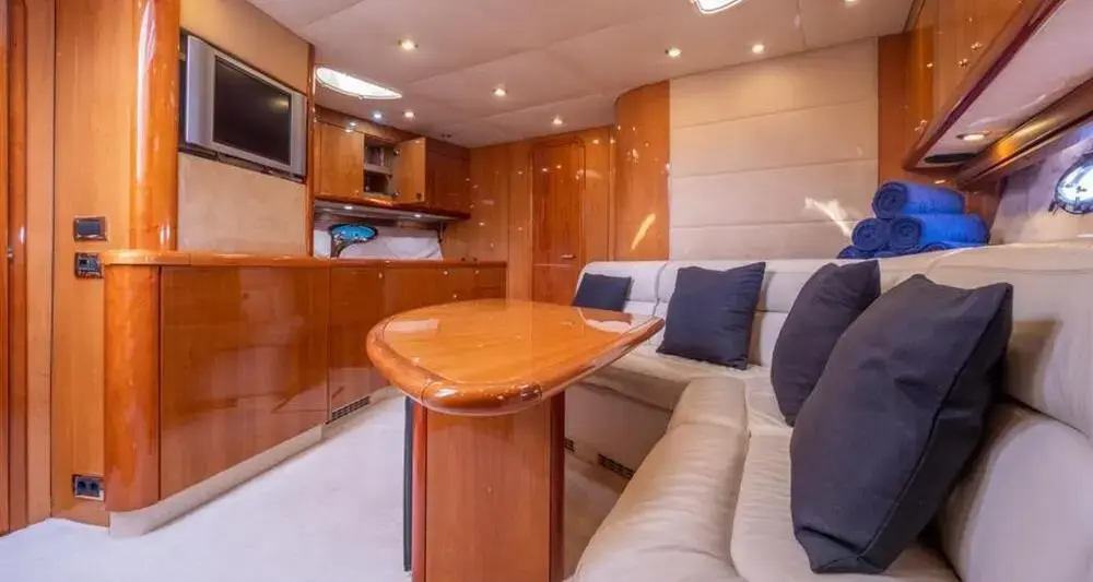 - Starboard side saloon fitted with a large sofa and table and plenty of storage, TV is positioned opposite the sofa