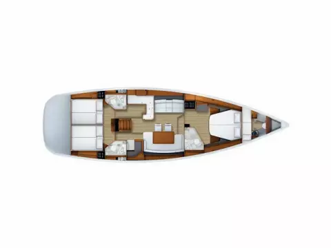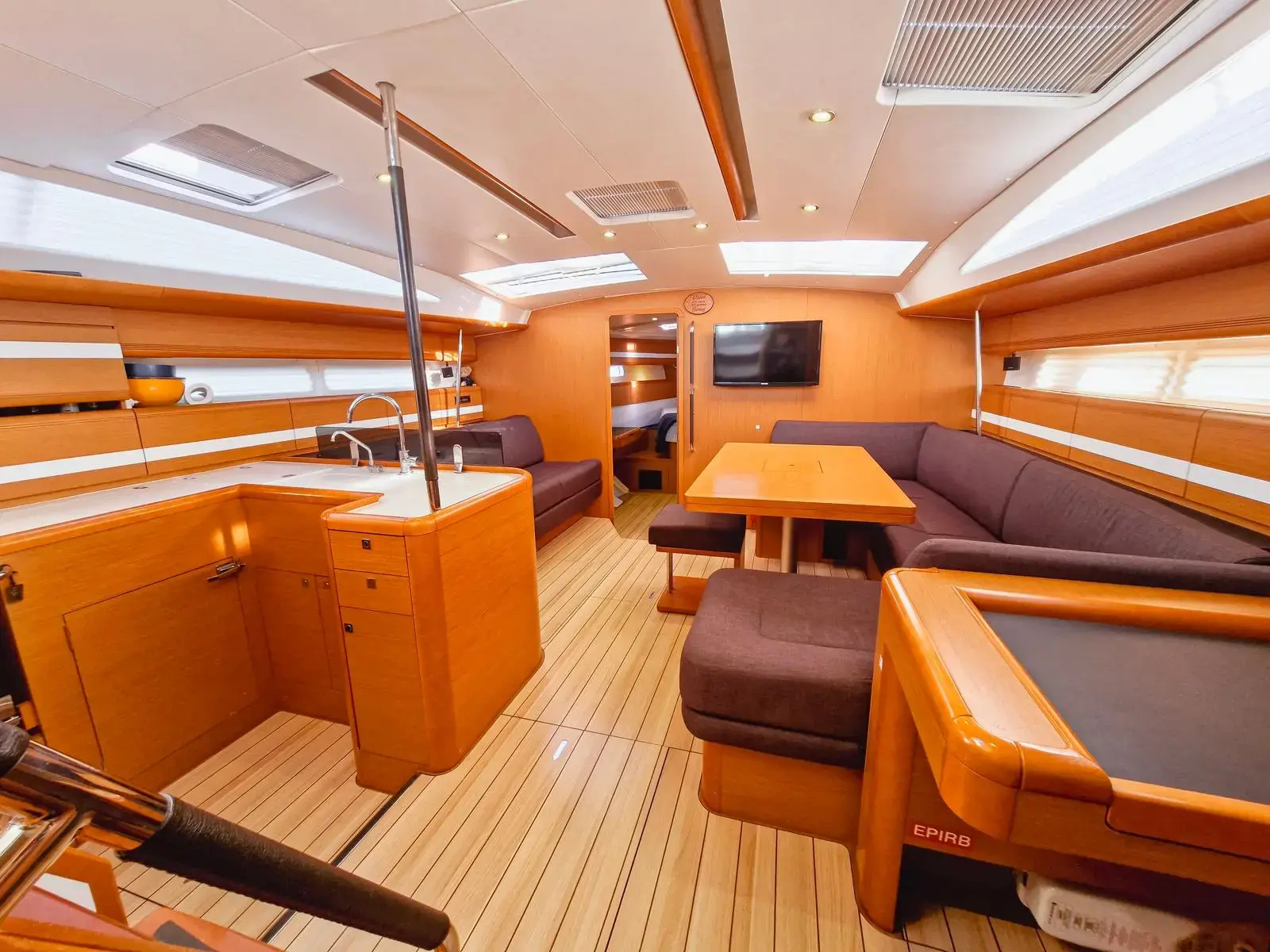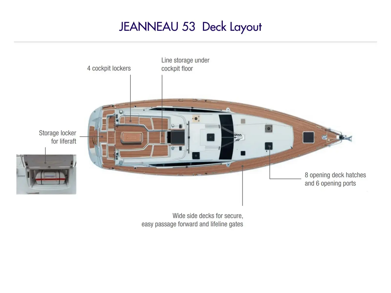This privately owned Jeanneau 53 is the desirable 3-cabin layout, with a full-beam forward owner’s suite and two guest cabins aft, each with their own heads. Built in 2015 and launched in Turkey, she’s been lightly used, professionally maintained, and thoughtfully upgraded for extended Mediterranean cruising — including generator, air conditioning, watermaker, and solar.
