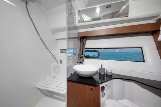 Fresh water electric toilet, shore water supply, windlass control at both helms