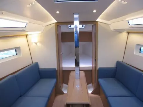 Step inside the Sun Odyssey 350 and be welcomed by a contemporary design that emphasizes comfort and spaciousness. With standing headroom of over 6 feet 1 inch, the saloon and cabins feel open and inviting. Wide windows in the hull and coachroof bathe the interior in natural light, while indirect lighting creates a warm and serene ambiance in the evening.
