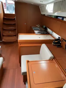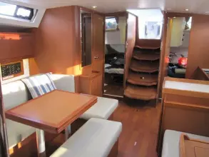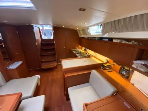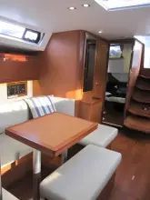 "Hey Jude III" is the very popular 3 cabin, 2 head layout in the traditional Mahogany interior wood with a light laminate sole. The enormous cockpit is a highlight of the Oceanis 45, equipped with a large cockpit table with loads of storage and a large swivel chartplotter aft. She also features fantastic seating, outdoor lighting, and a unique drop-down transom for even more room at anchor or dock. The mainsail arch, characteristic of all the large Oceanis yachts, is an important innovation that has led to many architectural developments, including a very gently sloping 45-degree companionway to the accommodations below.