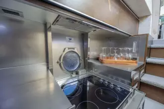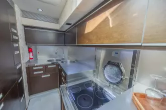 The galley aboard the 2009 Azimut 68S is thoughtfully designed to combine style and functionality, ensuring you have everything needed to prepare meals while cruising. This fully equipped kitchen features a modern refrigerator to keep your provisions fresh, a sleek kitchen stove for effortless cooking, and a polished stainless steel sink for convenient clean-up.