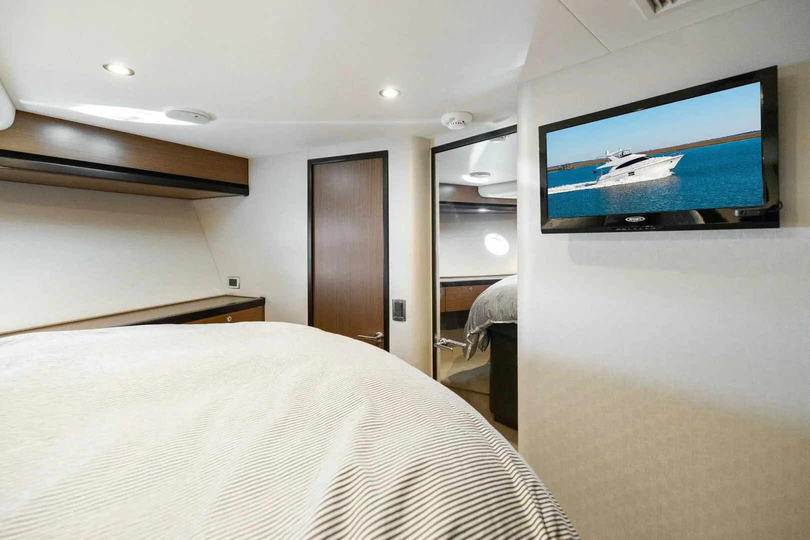 All the way forward, the VIP stateroom has an upgraded HMC level 4 Queen sized bed with custom decorative cover along with storage underneath. Additionally, there is private access to the guest head with upgraded wood flooring and a stone countertop.