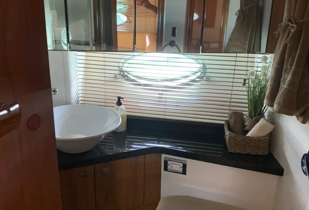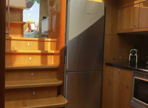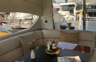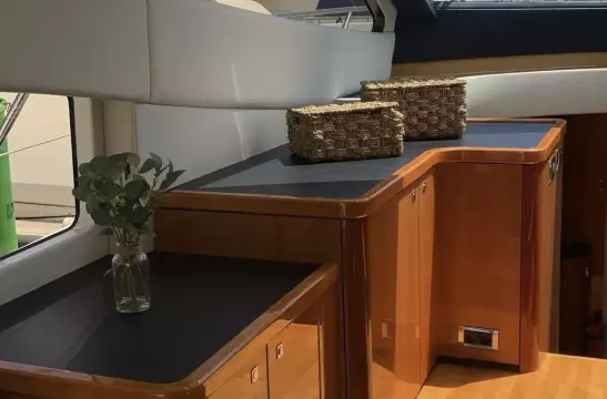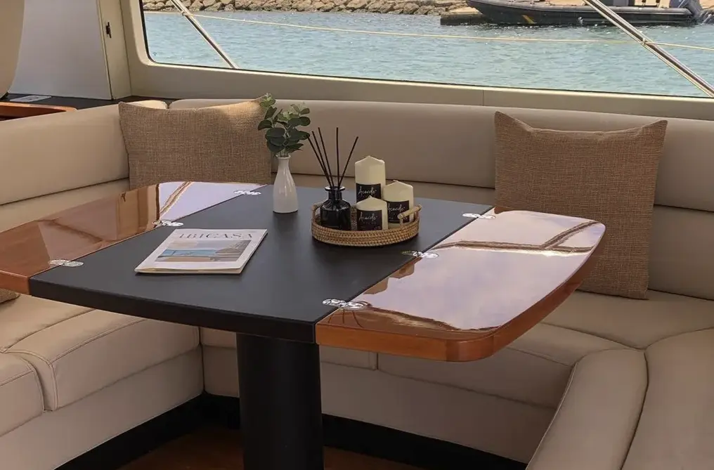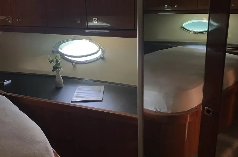 The main salon is bright and inviting, with panoramic windows, plush seating, and a dining area that accommodates six to eight diners. The fully equipped kitchen offers all modern conveniences, making dining on board a pleasure.