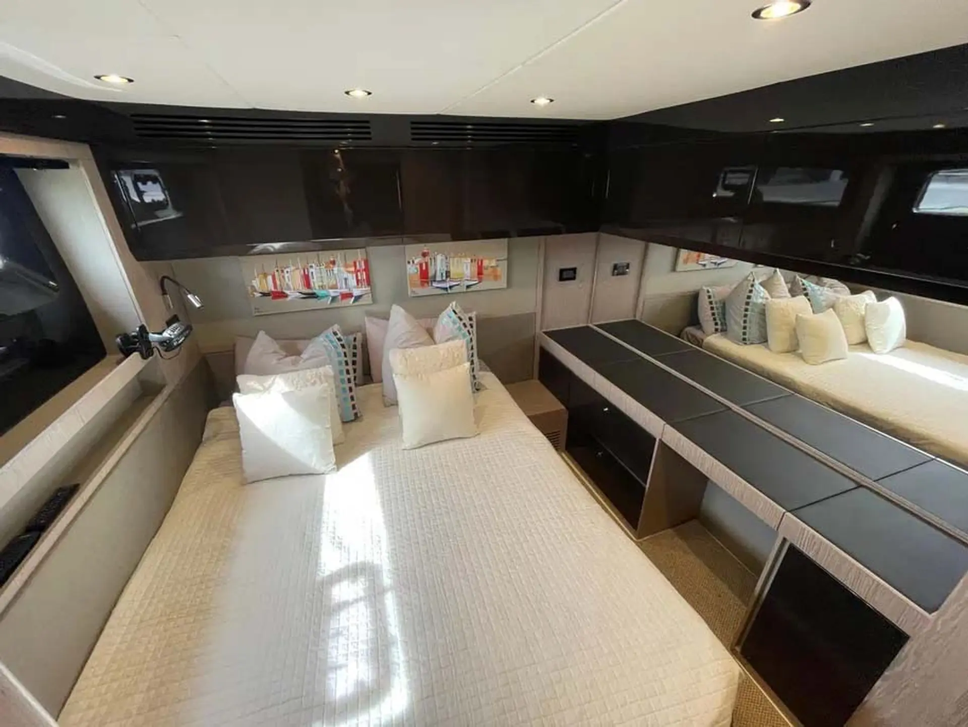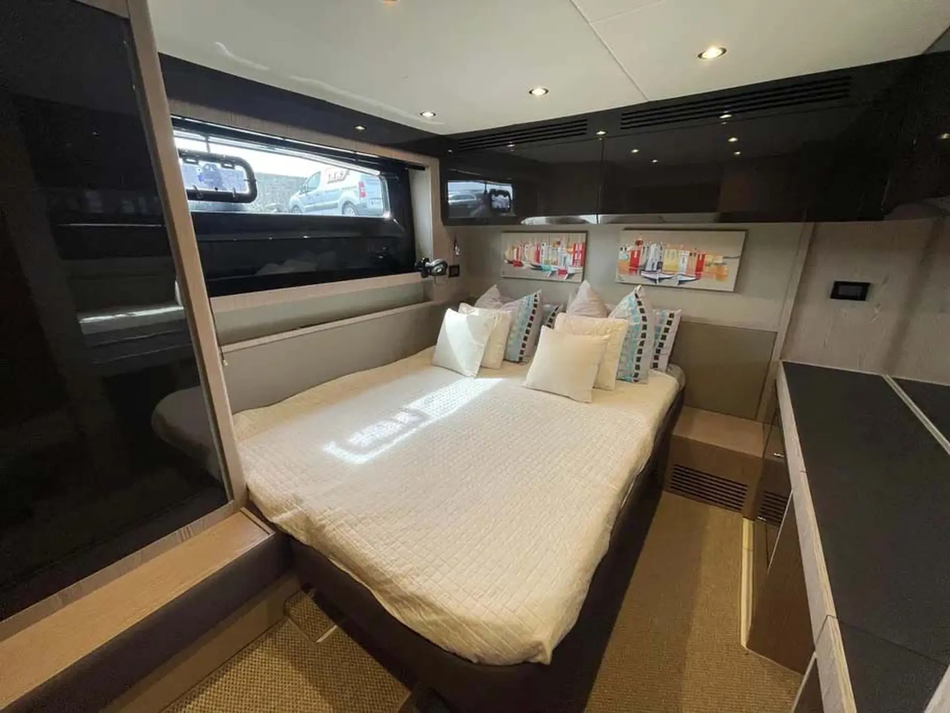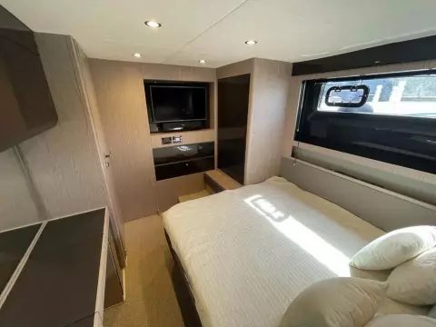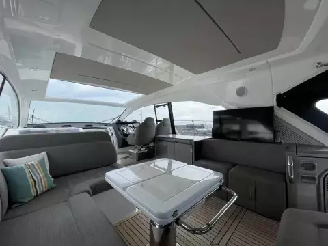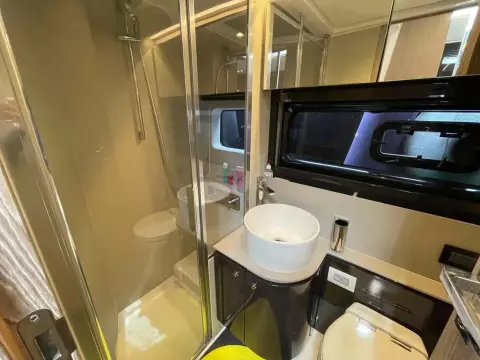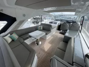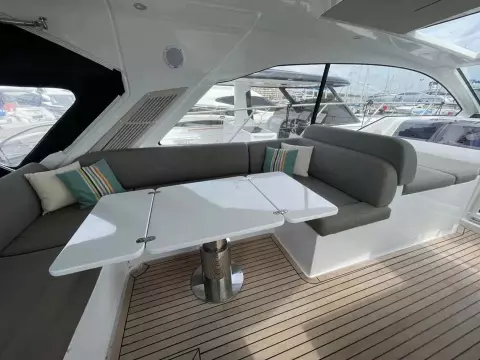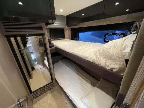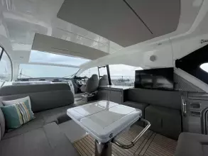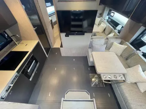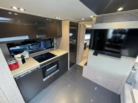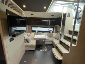 This boat combines comfort and sportiness with a top speed of 34 knots. Guaranteed maneuverability with her IPS propulsion.