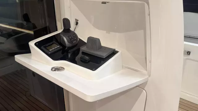 Volvo joystick control (dual station) with low speed manoeuvring in 'docking mode' and steering at any speed in 'driving mode'. Operates engines, steering and thruster(s) including stern thruster when fitted (includes uprating standard bow thruster to 210KgF variable speed). Third station controls in cockpit including thruster controls and emergency stop. Hold function docking facility, includes fitting a 210 kgf variable speed sternthruster.