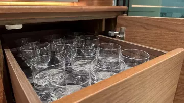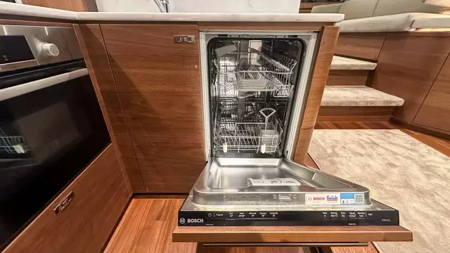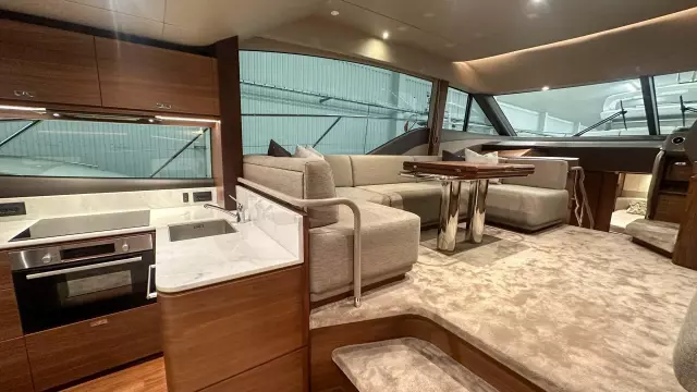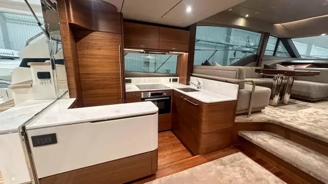 Galley worktops are Sylmar White Solid Surface as standard to match the bar top (NB. Cockpit bar top will match galley worktop selection). Other galley top colour: Carrara White.
