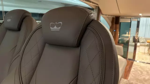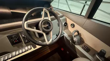 Elevate the overall styling and ambiance of your yacht with design elements selected exclusively from the Design Studio Collection. Allure Collection II (no hardtop). Interior styling includes quilting detail with contrast piping and panelling to lower helm seats, Pininfarina design steering wheel to lower helm. Exterior styling includes quilting detail with contrast piping and panelling to flybridge helm seats, Pininfarina design steering wheel to flybridge helm, Flybridge console finished in Oyster Grey, Flybridge wetbar finished in Oyster Grey, Foredeck sunbed cushions and adjustable headrests, Exterior upholstery in Comfort Exterior III Met Ice with Macadamia contrast panels and piping.