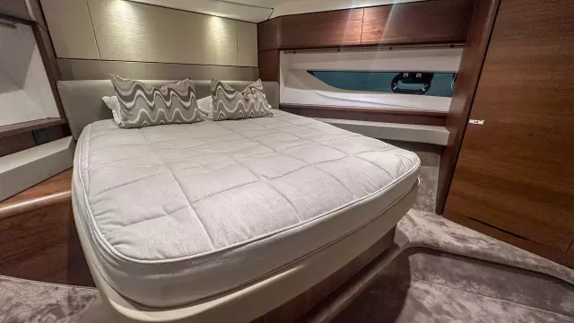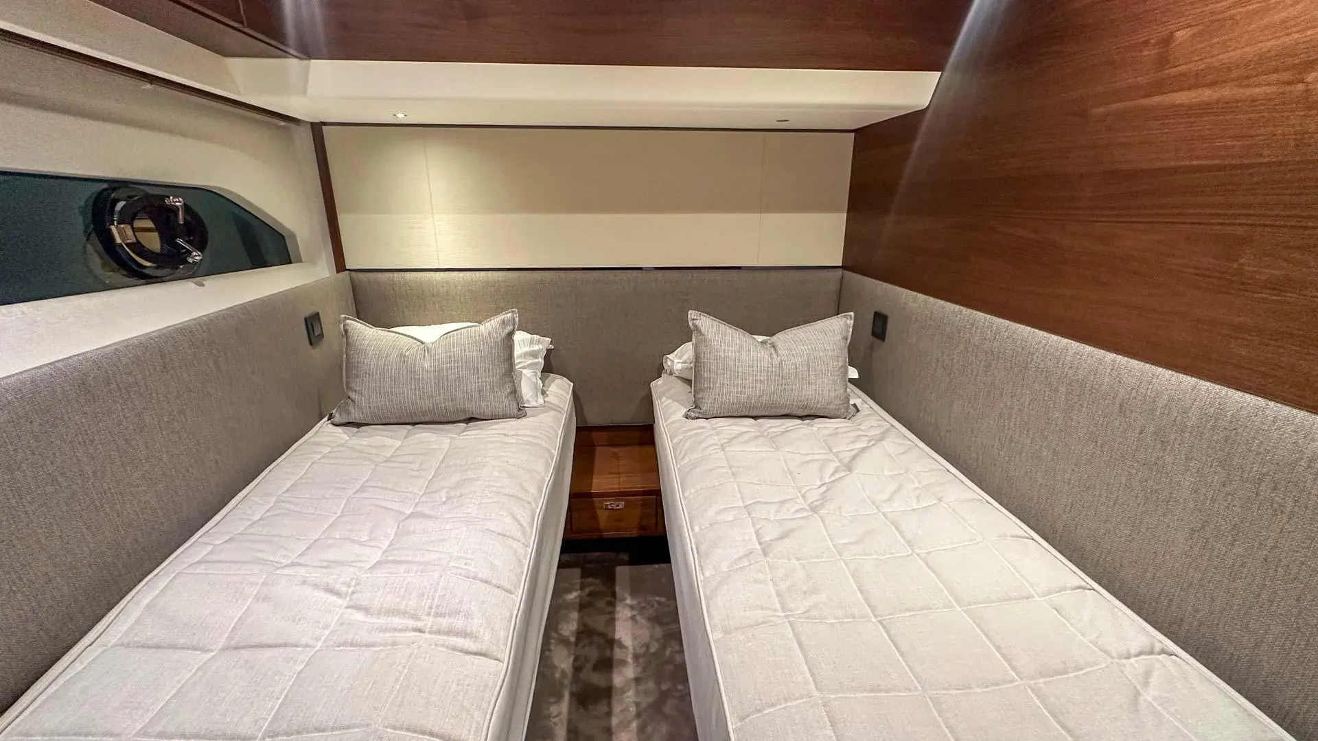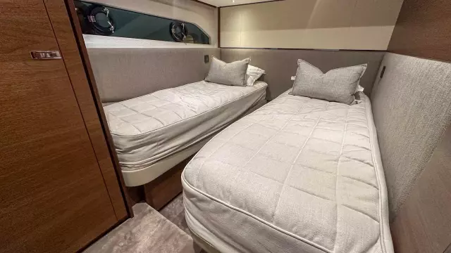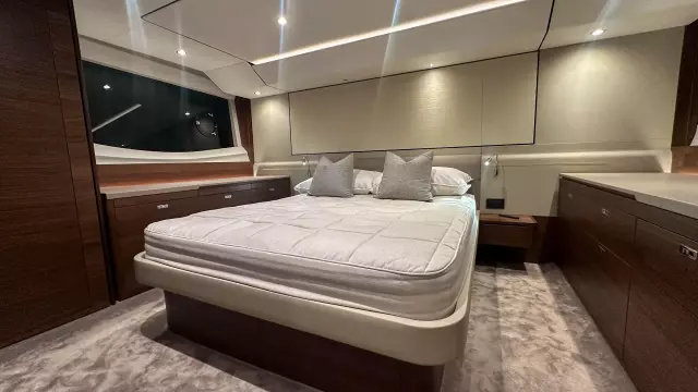 Walnut interior wood satin finish (includes all galley units) (galley floor is planked walnut as standard). Standard helm console is Grey soft touch with Quartz III Putty leather helm seats. Safe. Fit 2 x Audrey flexible bunk light one on each side of stateroom bed.