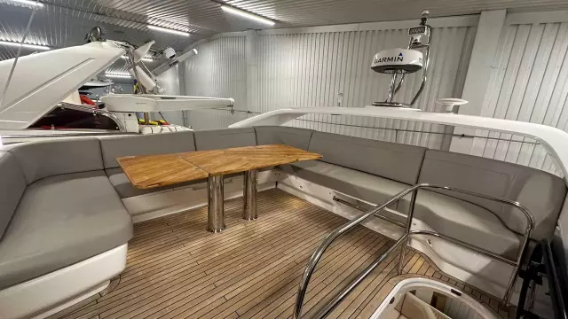 Transom platform to have electro-hydraulic raise/lower facility (450Kg SWL) with keyway plates. Teak laid side decks, foredeck and coachroof walkthrough. Teak laid flybridge deck. Side boarding doors to cockpit area. Additional 20m of 10mm anchor chain to give a total of 60 metres. Chain counter on fore windlass on upper and lower helm. Scandinavian drop-down pulpit fore. Teak table fitted on foredeck. Stainless steel anchor in place of standard (25Kg).