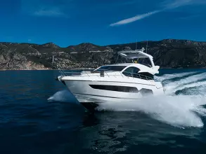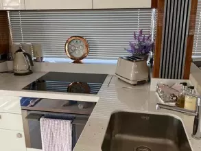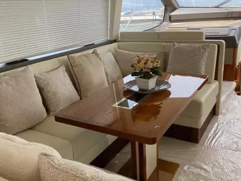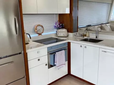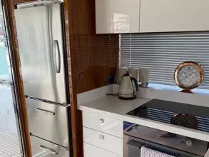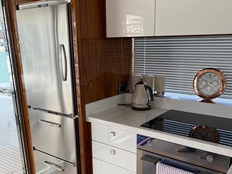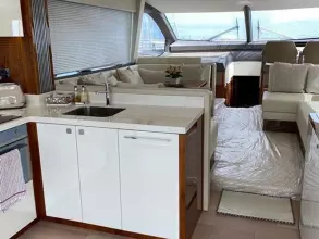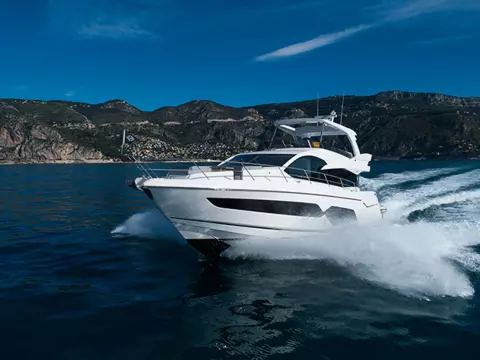 The flybridge creates the feeling of being on board a much larger craft, with large sunbathing areas forward and a well-equipped wet bar.