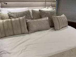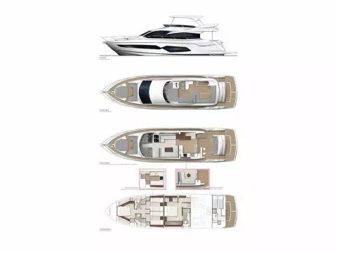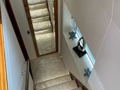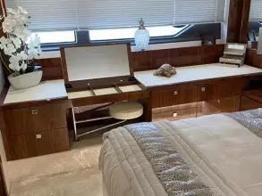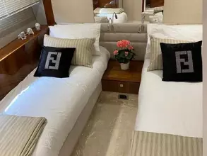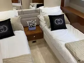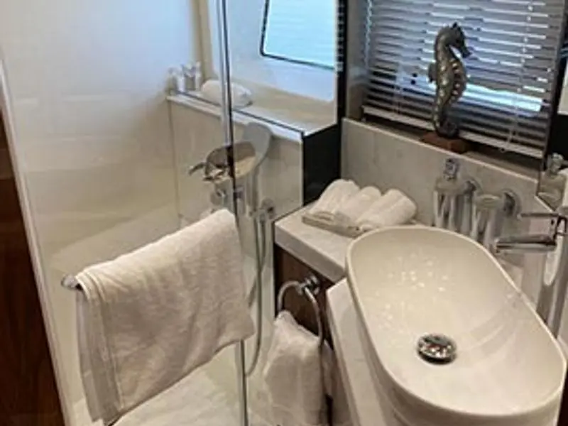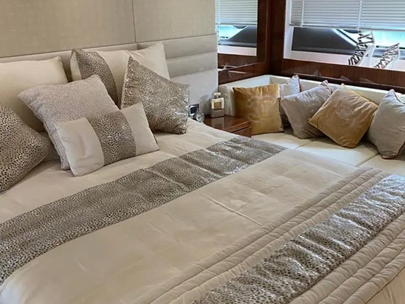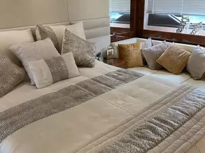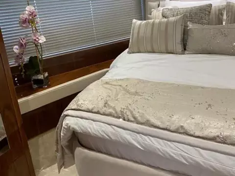 Thanks to the galley being situated on the main deck, she has four very spacious cabins below, including two large twin cabins, a forward VIP suite, and a standout full-beam master cabin with its own private stairway access from the saloon; a first for Sunseeker in this size range.
