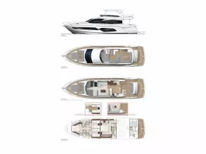 Her exterior lines flow effortlessly from the Portuguese-bridge bow seating and sunbathing areas to the expansive cockpit adjoining the well-equipped aft galley and saloon on the main deck.