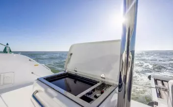 • Swiveling gas BBQ at starboard transom with matching storage module to port.