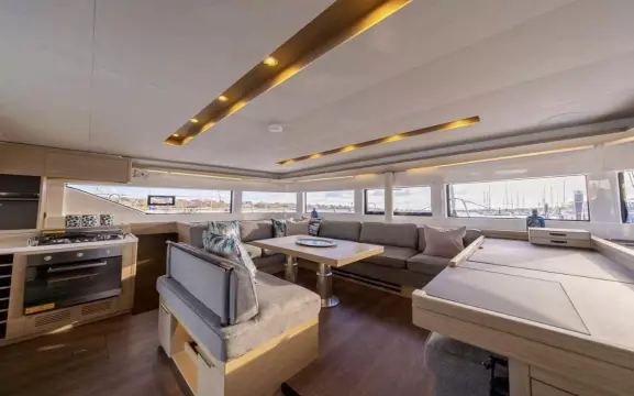 Extended transoms provide effortless access to the dock and the water, integrating with a beach deck featuring a hi-low tender platform on one level. The mast is positioned forward, ensuring an uncluttered salon, separated from the voluminous galley and thoroughfare area.