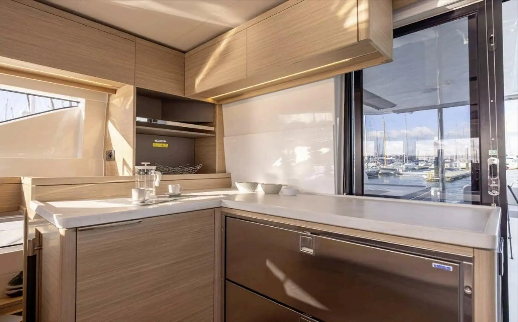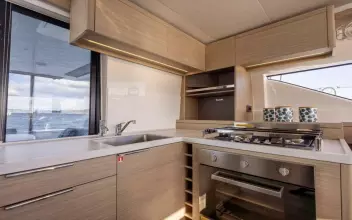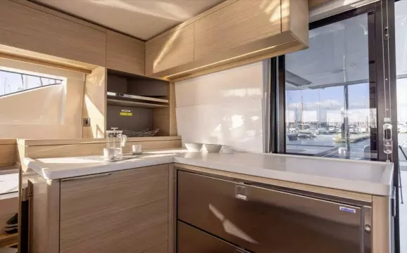 • Grey composite finish on galley furniture.