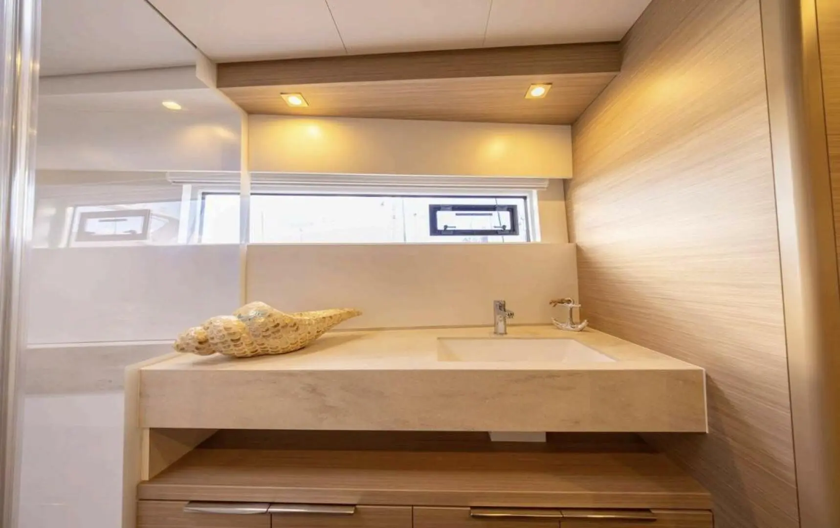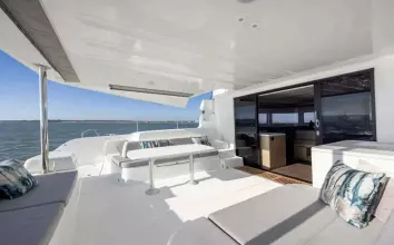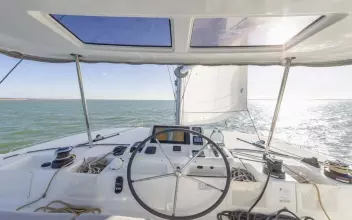 • The port hull has two double cabins with en-suite bathrooms and another cabin midship.