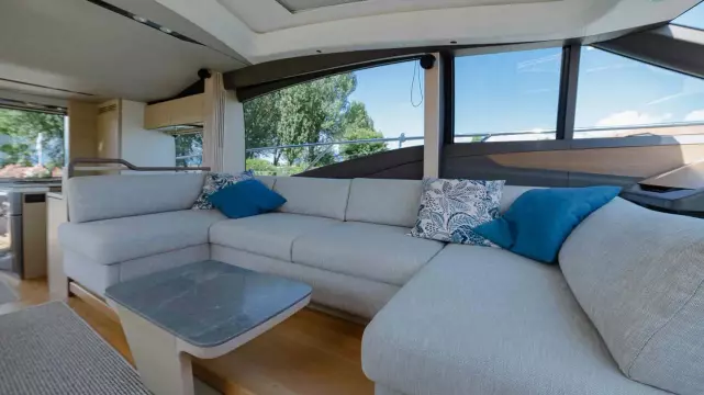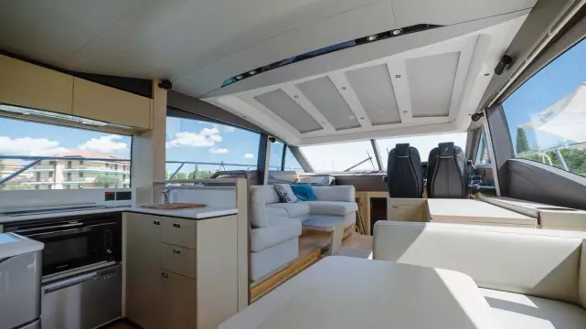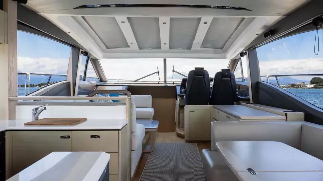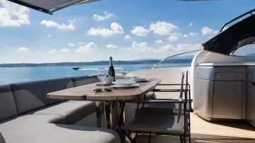 The elegant lines of the V60 form the backdrop to its spacious, user-friendly cockpit, with plenty of seating and a fully equipped bar with barbecue.