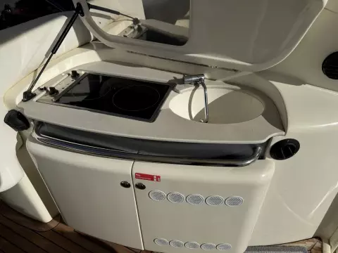 - COCKPIT: large sunbathing pad (6'6") with cushions over dinghy garage. Spacious U shaped seating area to port around varnished teak table with ample room for 6-8 people. Outside wet bar to starboard equipped with electric BBQ plate, sink and fridge. Further sunbathing on forward coachroof.