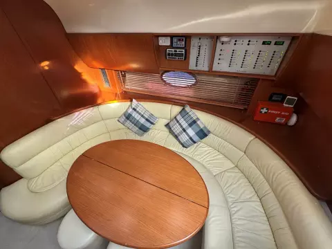 - SALOON: U-shaped saloon seating to starboard which converts to occasional double berth by electric hi-lo folding teak saloon table with stylish and practical metal support. Overhead storage cupboards.