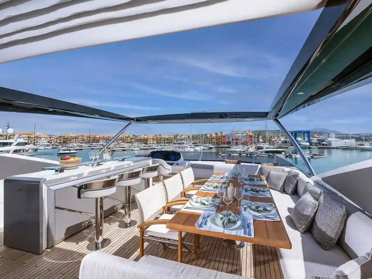 The flybridge is a staggering 25% larger than a comparable yacht, and owners can select an infinity spa pool and sideboard with a second integrated BBQ.