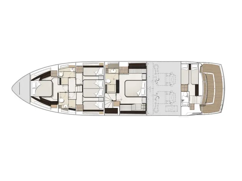 Internally, the expansive main saloon benefits from sweeping glazing that extends below the TV console, revealing glimpses of the sea from all perspectives. The fully-equipped aft galley with a large dinette links seamlessly to the cockpit via full-width sliding doors, promoting togetherness. The innovative design layout allows owners to welcome guests with a strong focus on ambient lighting and interior detailing. Access to the spacious guest cabins is via the lower helm and elevated companion seating, while the sumptuous master cabin amidships is accessed via its own staircase to port. This exceptional layout facilitates effortless movement between spaces. The interiors showcase exquisite attention to detail with a new palette of upholstery that provides a cool, crisp, and contemporary look, unmistakably a Manhattan.