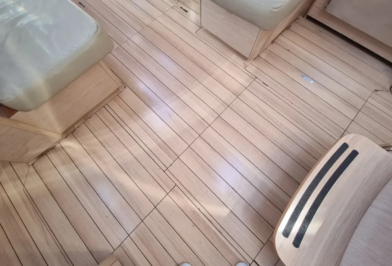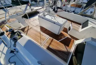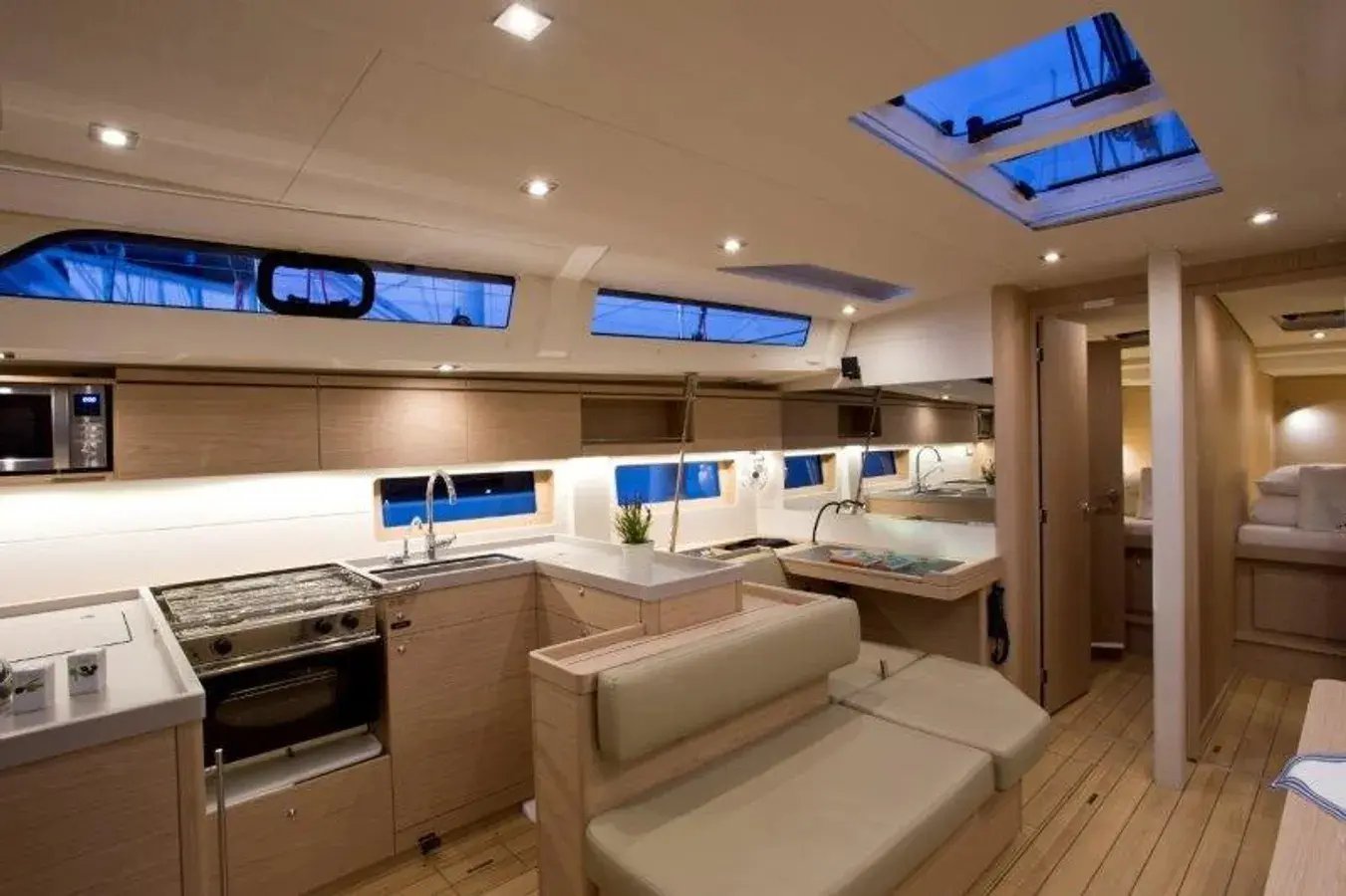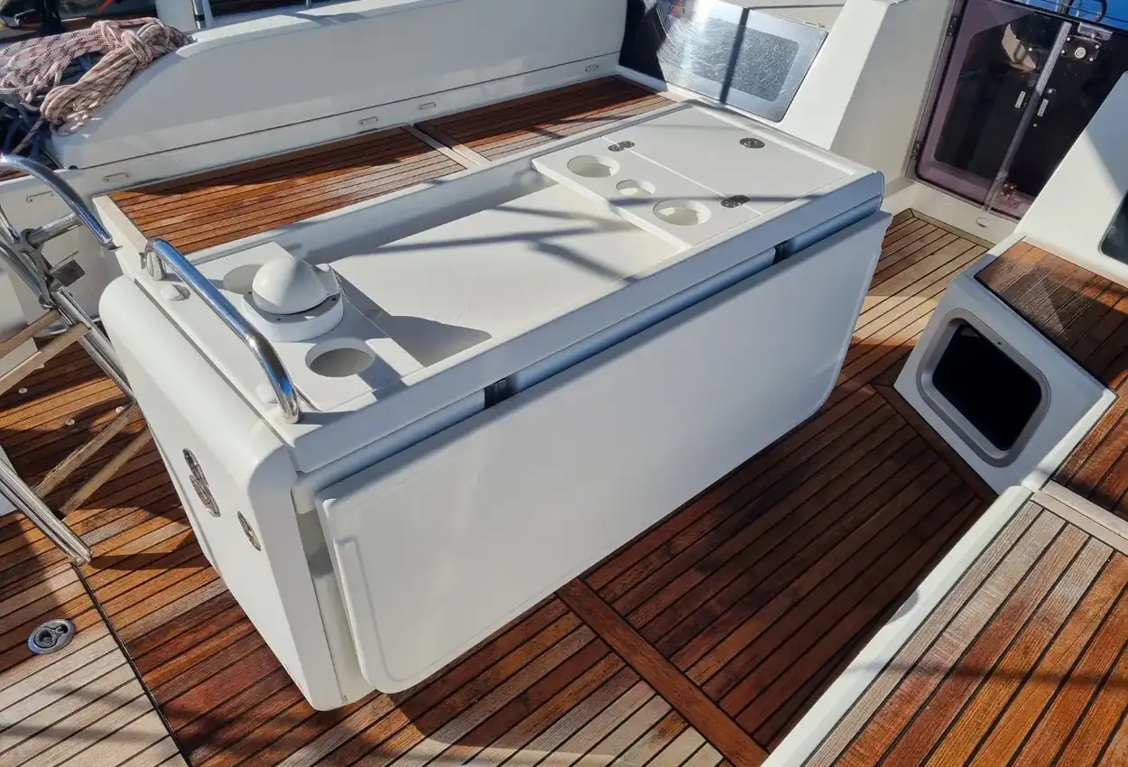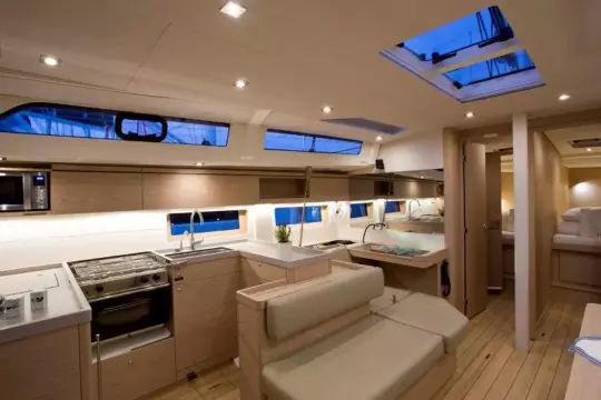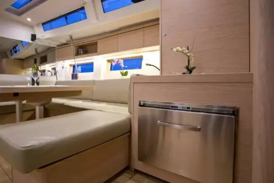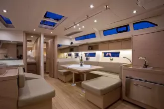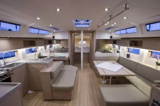 - U-shaped saloon settee with saloon table that can be converted to 2 extra berths on starboard side and opposite L-shaped saloon settee with navigation desk