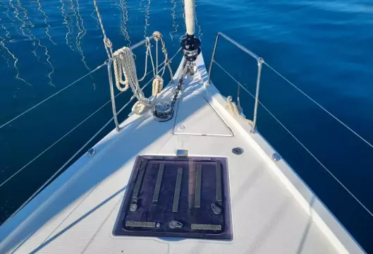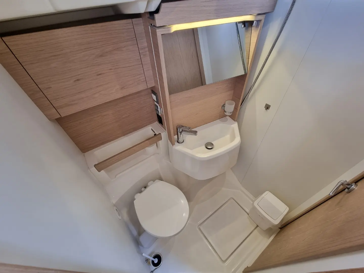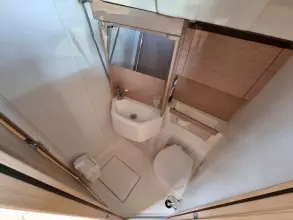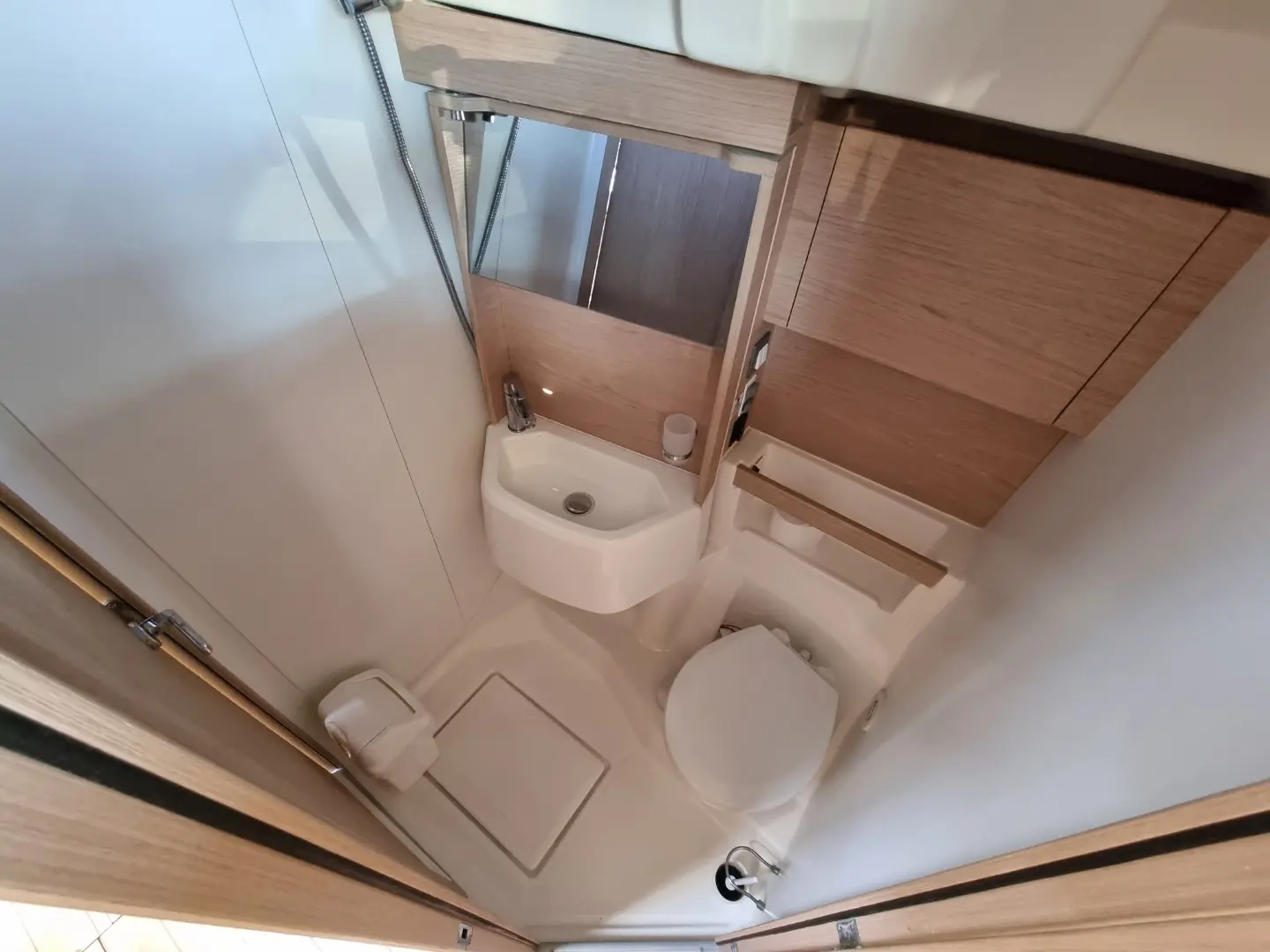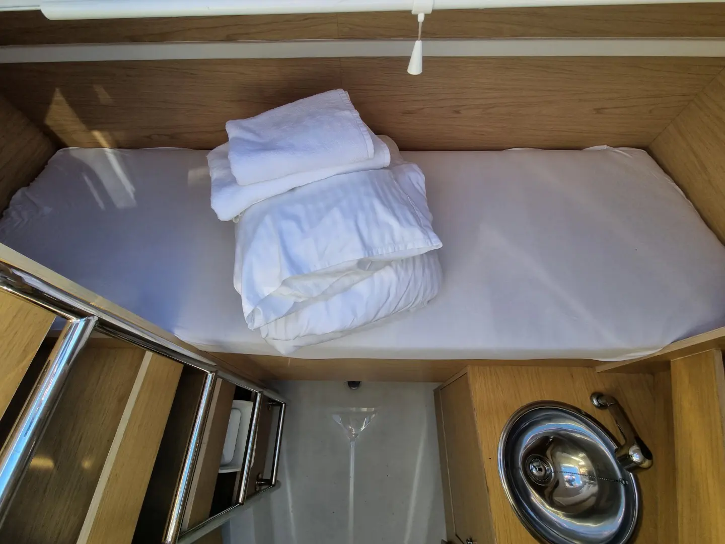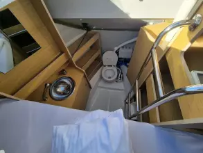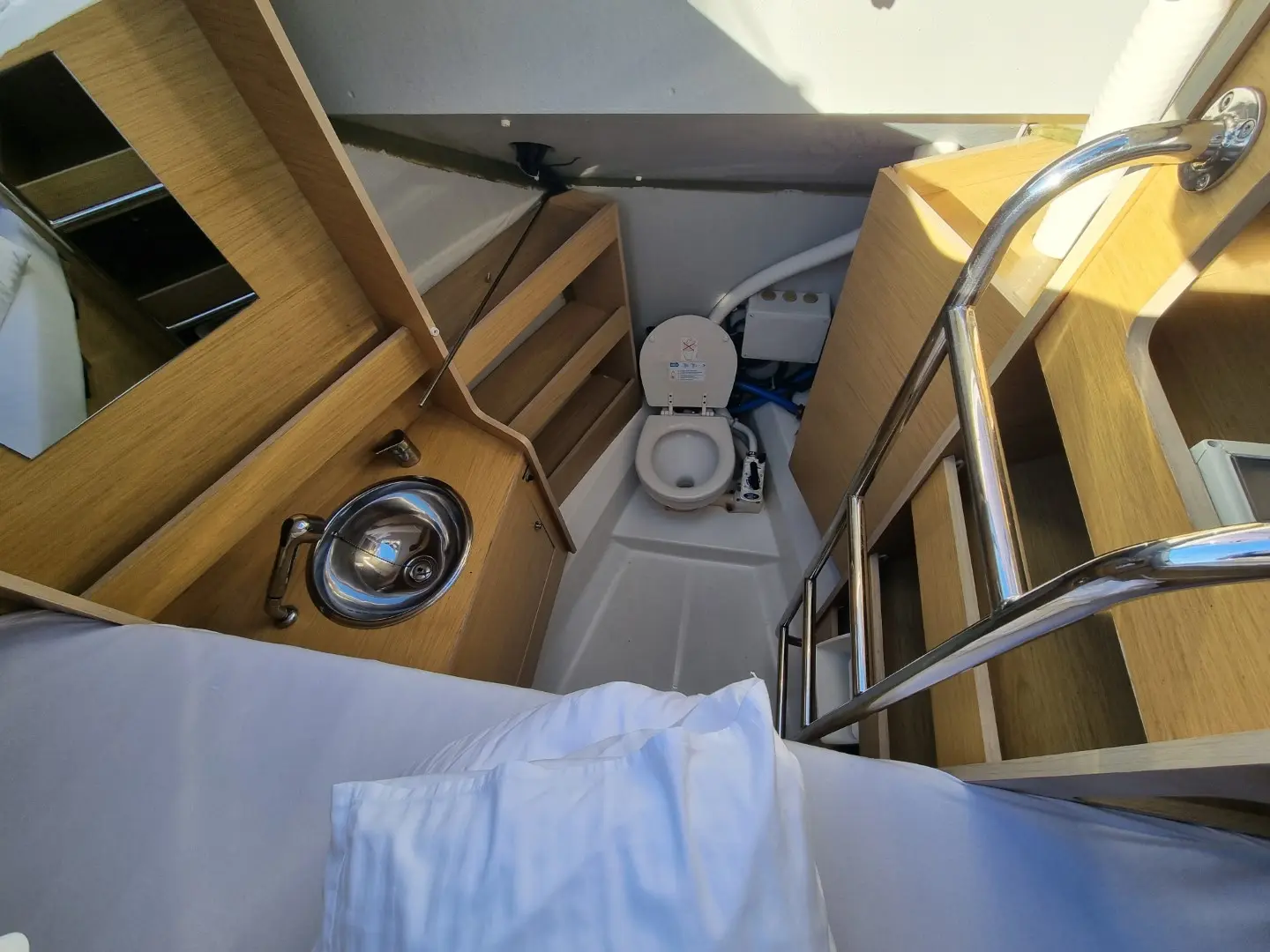 - Skipper cabin in bow with single bed, Jabsco manual toilet and washbasin and entrance ladders