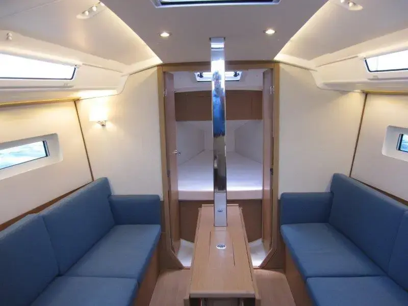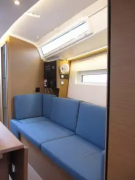 Step inside the Sun Odyssey 350 and be welcomed by a contemporary design that emphasizes comfort and spaciousness. With standing headroom of over 6 feet 1 inch, the saloon and cabins feel open and inviting. Wide windows in the hull and coachroof bathe the interior in natural light, while indirect lighting creates a warm and serene ambiance in the evening.