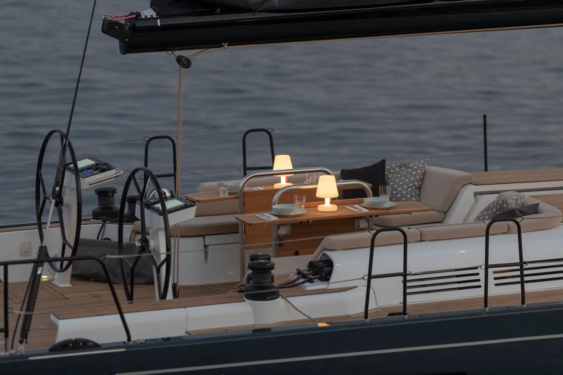 - 2 Teak cockpit tables with extensions on stainless steel pedestal and Charcoal Grey covers