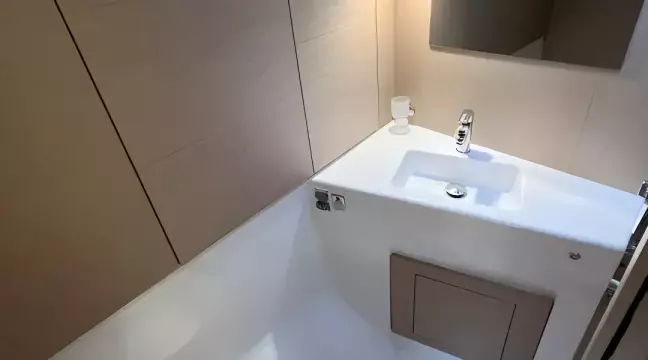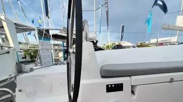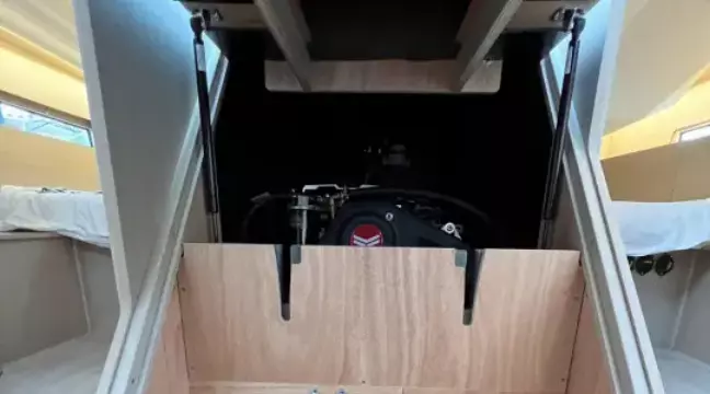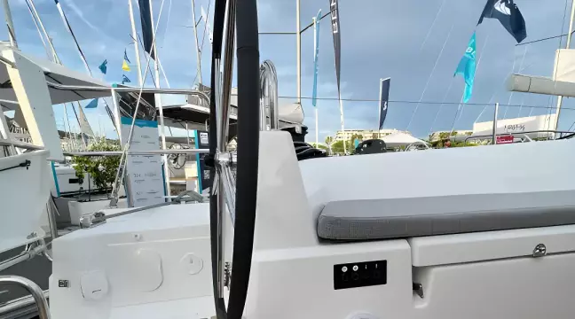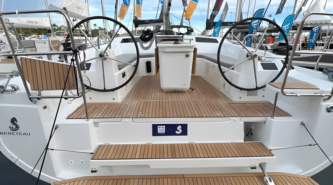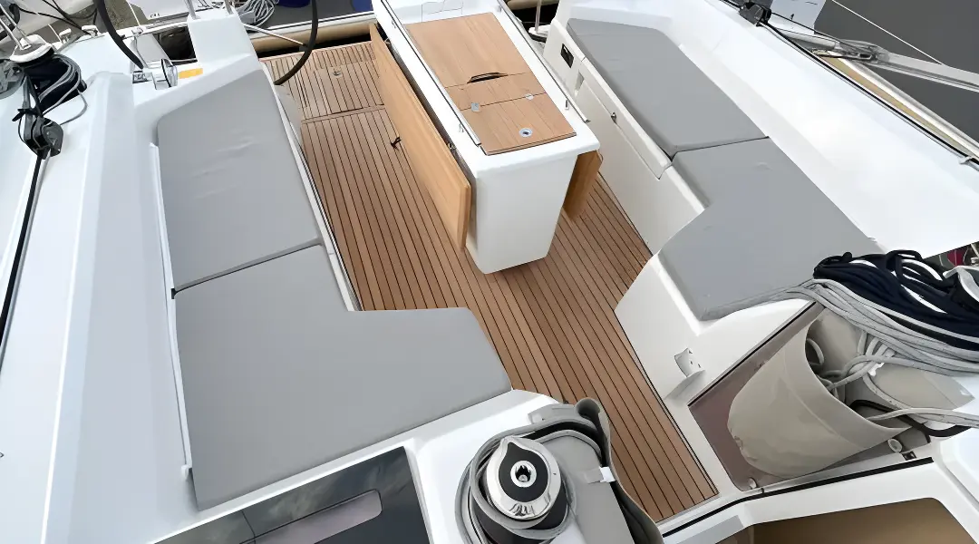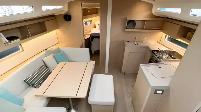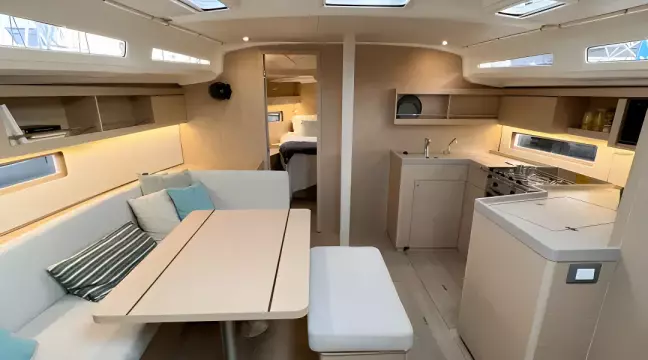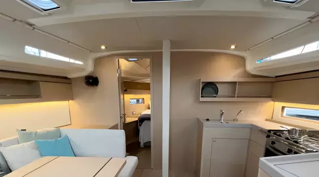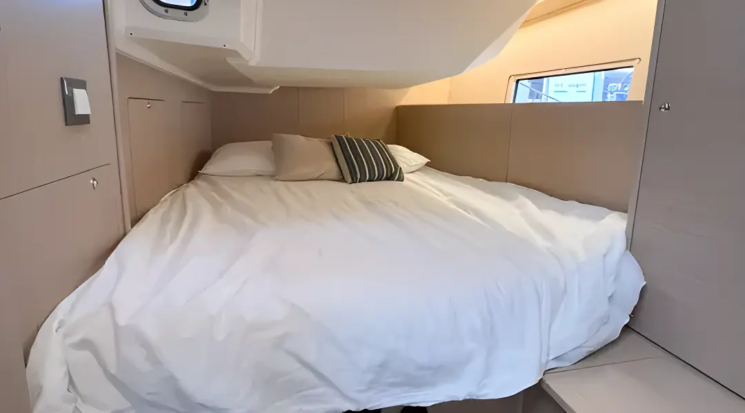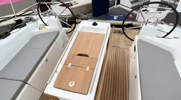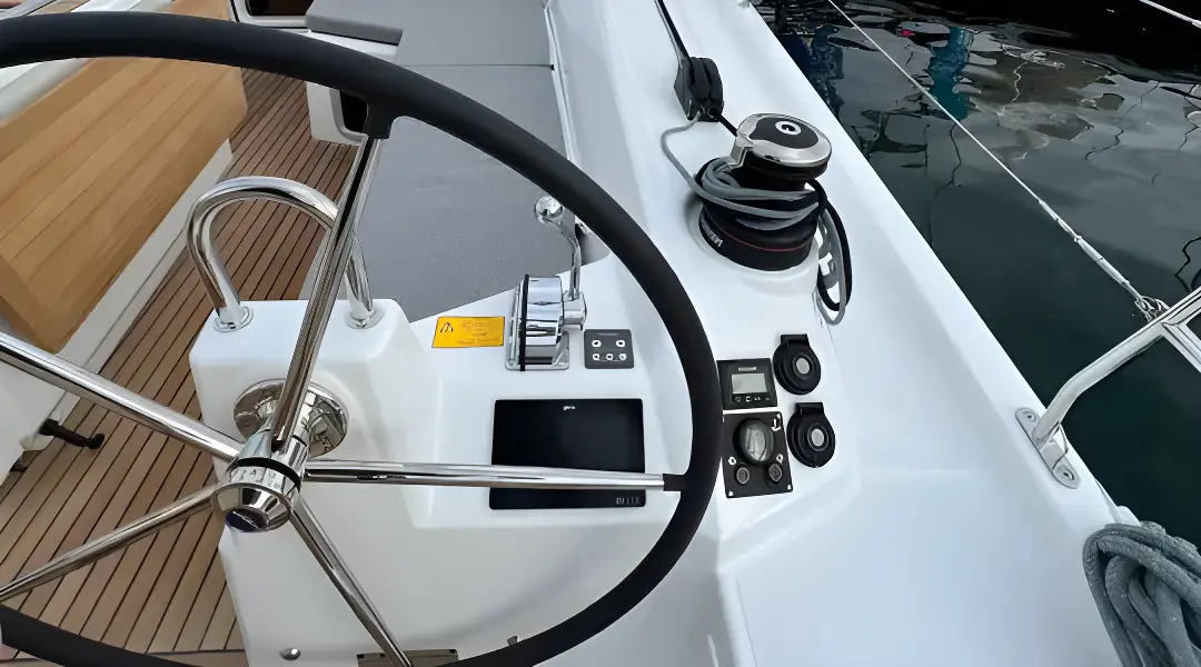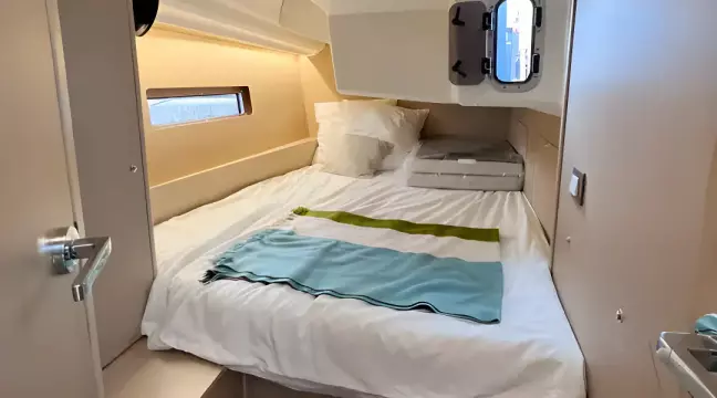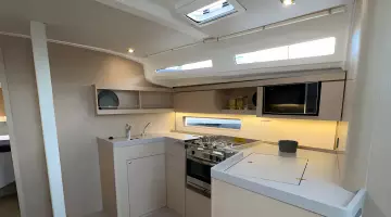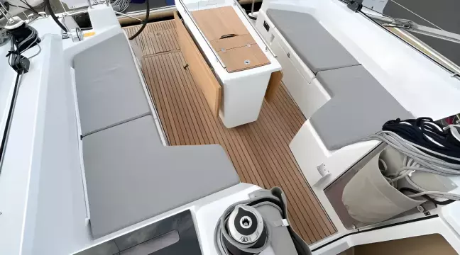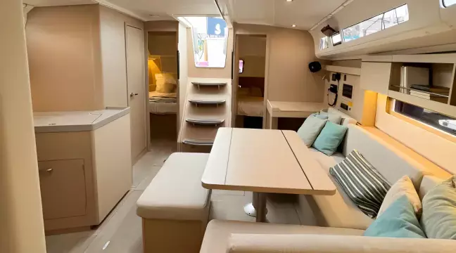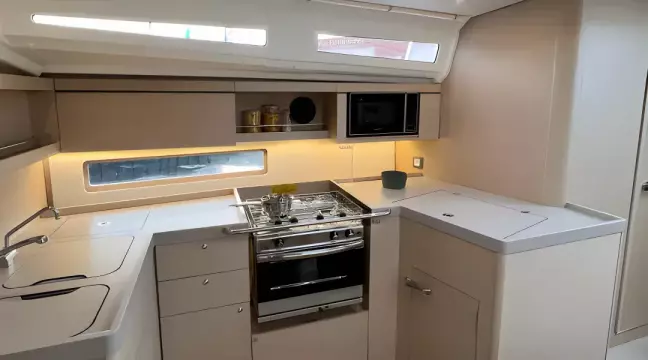 On a technical level, it includes the Raymarine Offshore Pack, with Axiom+ touch screens, autopilot, VHF with AIS and sounder, as well as the Upwind + Downwind Pack with complete maneuvering for headsails and rigging for code 0. It also includes an additional water tank (565 L total), LED lighting, Fusion HIFI, microwave oven, fans, IRO-DECK in the cockpit, and much more.