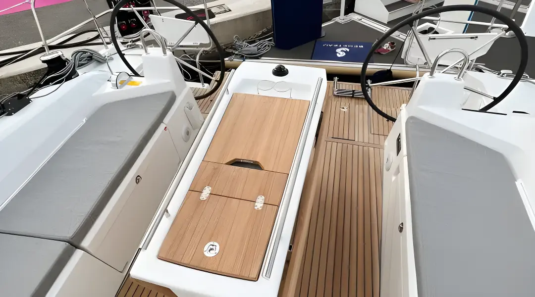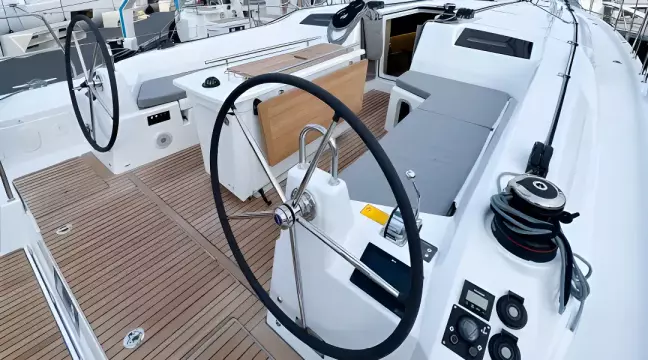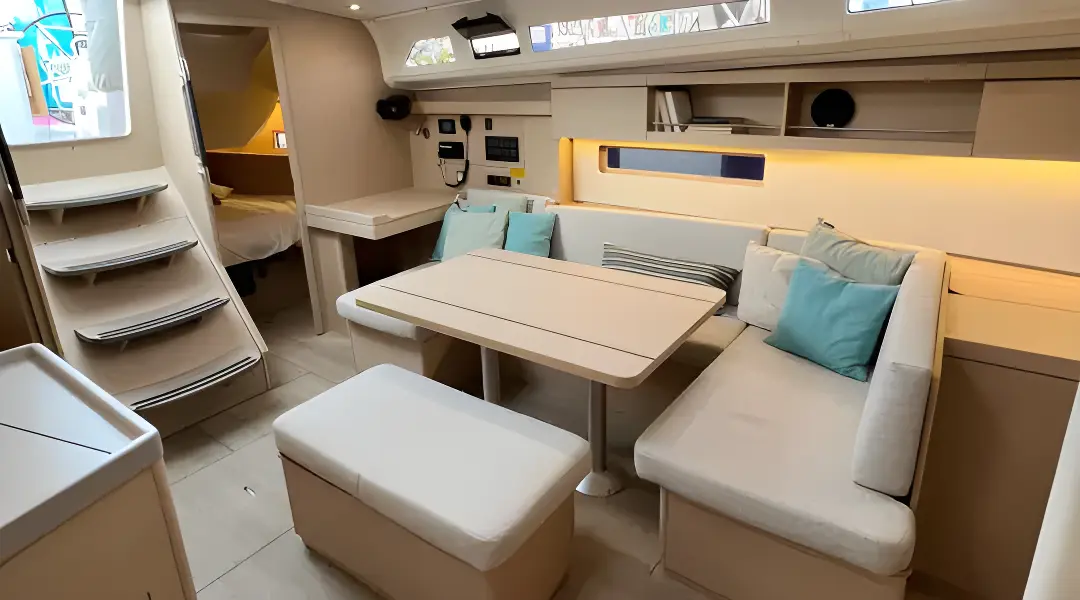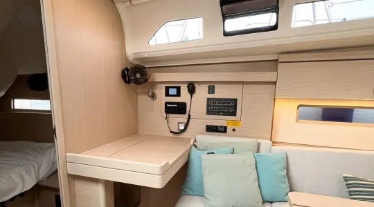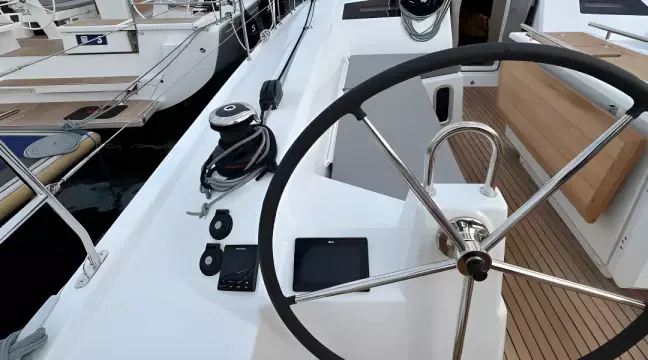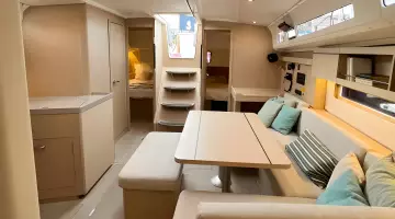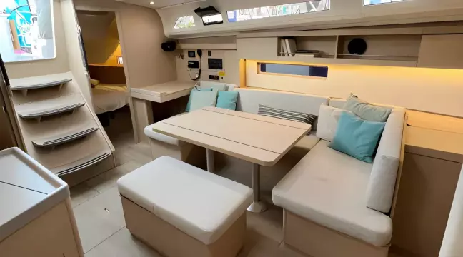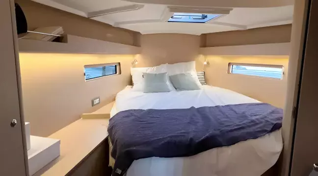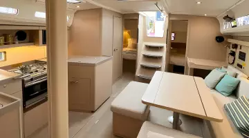 With a layout of 3 cabins and 2 bathrooms, larger and furling genoa, electric winches for genoa sheets, and a long draft keel, this unit is equipped with everything needed for a safe and enjoyable sailing experience. It also features an electric swim platform, full bimini with closure, Dolce 5 cockpit cushions, retractable bow thruster, electric toilets, and a 12V/230V converter.