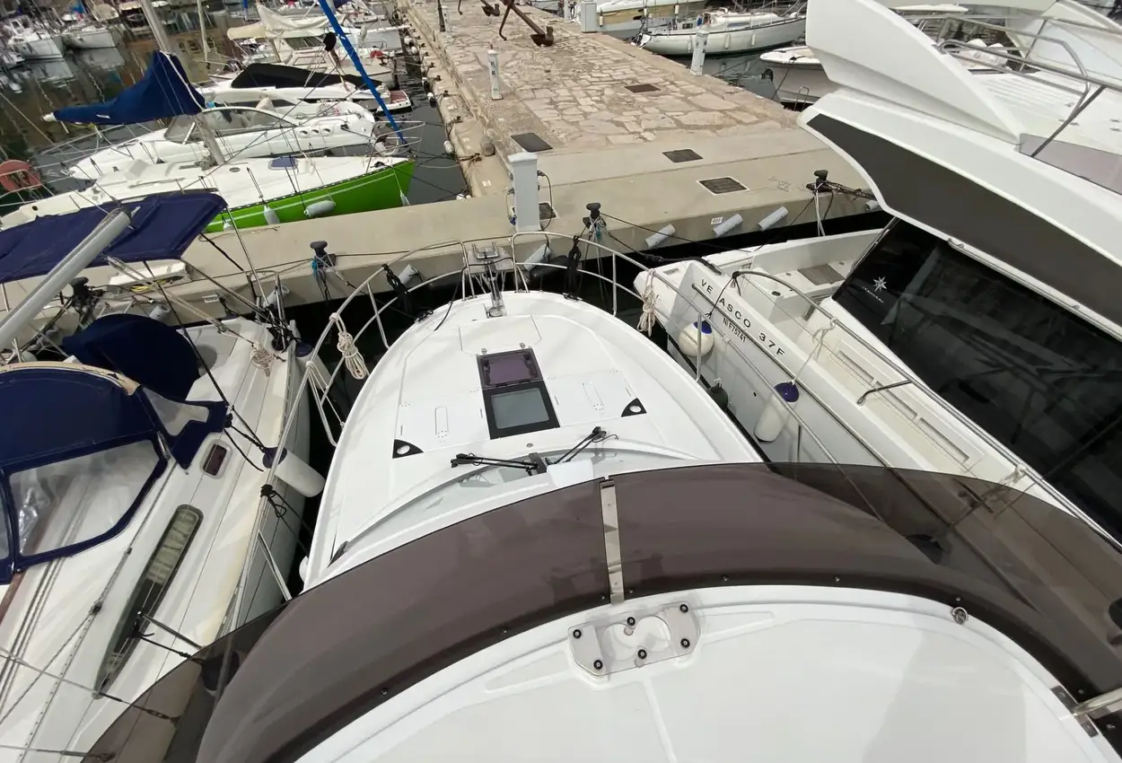 A flybridge cruise boat for an incredible panoramic view to sip a cocktail quietly in front of a sunset, a boat with two levels, two atmospheres.