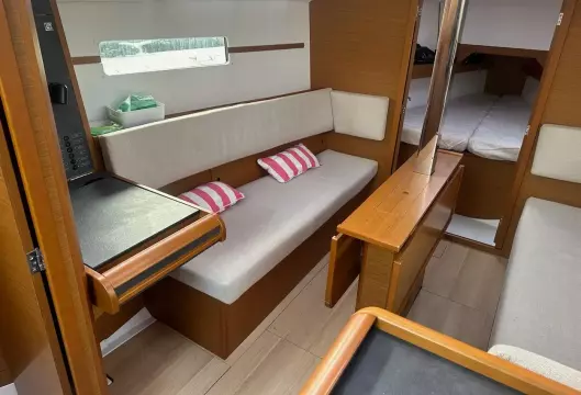 - The Sun Odyssey 349 is designed by Marc Lombard Yacht Design Group and features a hard chine hull which enhances stability and performance. It has a 9/10 fractional sloop rig, twin rudders. The interior is spacious with substantial headroom, making it comfortable for extended cruising. The saloon is inviting and perfect for entertaining, with modular living spaces that adapt to different moments while cruising. The boat also features a removable seat and retractable chart table.