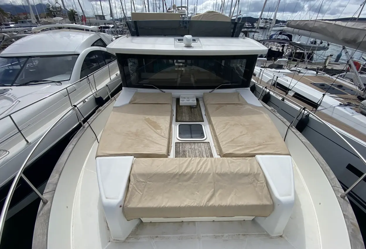 - Forward sun deck area with cushions and cup holders
