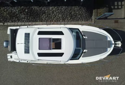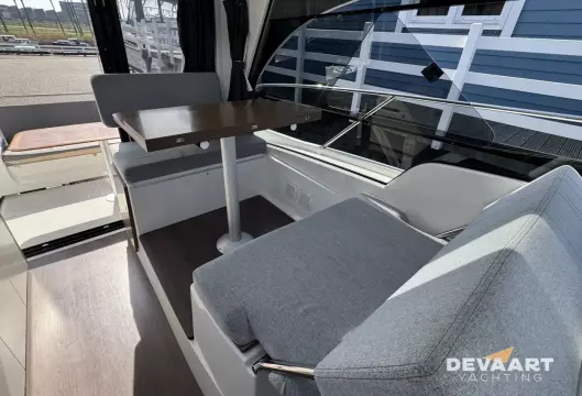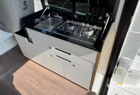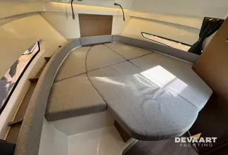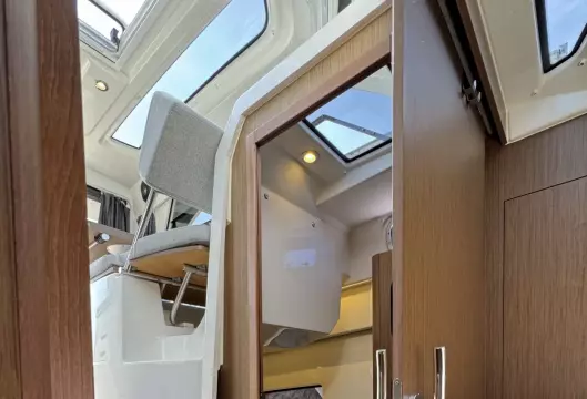 The salon situates the sitting area, kitchen, and steering position. The interior features a walnut-look finish combined with gray upholstery. Next to the steering position is the folding co-pilot bench allowing the "passenger" to look ahead while cruising.