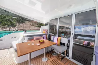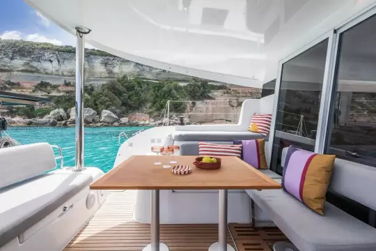 ALWAYS DREAM BIG! With the new Lagoon 38, each moment at sea is an escape from the everyday, a journey where dream destinations become realities and where memories are made in a comfortable, serene, inviting atmosphere. STEP ABOARD WITH FULL PEACE OF MIND The extended, specially adapted transoms of the Lagoon 38 enable safe, easy access. The layout is designed to simplify life on board. This catamaran offers freedom of movement, enabling you to take full advantage of each moment of the journey. ATMOSPHERE OF A LARGE CATAMARAN The Lagoon 38 offers an exceptional quality of life on board, owing to her new hull form. Her optimized interior living areas invite relaxation, ideal for gathering family in a generous saloon. Enjoy sharing special moments with friends, as well, seated around a large table. 'IN & OUT" LIVING SPACE Designed to connect the interior and exterior, the Lagoon 38 features a sliding glass door, which opens to create a continuous living space between the saloon and cockpit. This modular design accommodates up to ten people, dining in a warm, inviting atmosphere. CALM, A PRECIOUS COMMODITY And when the time comes for rest, recharge in a bright, peaceful owners cabin. Her large forward berth, with en suite head and shower compartment aft, ensures generous space and copious storage.