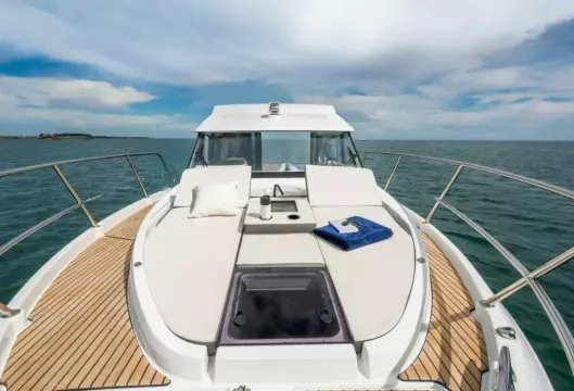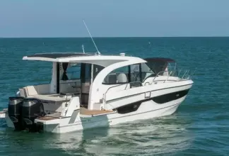 Light and cruising comfort characterize this large weekender. The double master cabin with en-suite shower room is well above the usual standards. The aft cabin is full beam and has three berths. The Antares 11 has a convertible saloon and can accommodate up to 7 people in excellent conditions. The extensive glazing in the wheelhouse provide a stunning all-around view. With the hallmark of a weekender range whose qualities have stood the test of time for over 40 years, this wonderful family cruiser powerboat is designed for a multiple boating programs, and therefore for a wide variety of fun leisure activities! Powered with up to 2 x 300 hp outboard engines she boasts fine performances. Her many innovative solutions ensure a high level of comfort: aft sun bench, side swim platform creating a sea-view terrace, flush deck connecting almost seamlessly with the cockpit and the wheelhouse.