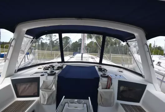 • Canvas: full cockpit/bimini, aft cover, companionway, bug screen (Sunbrella); dodger